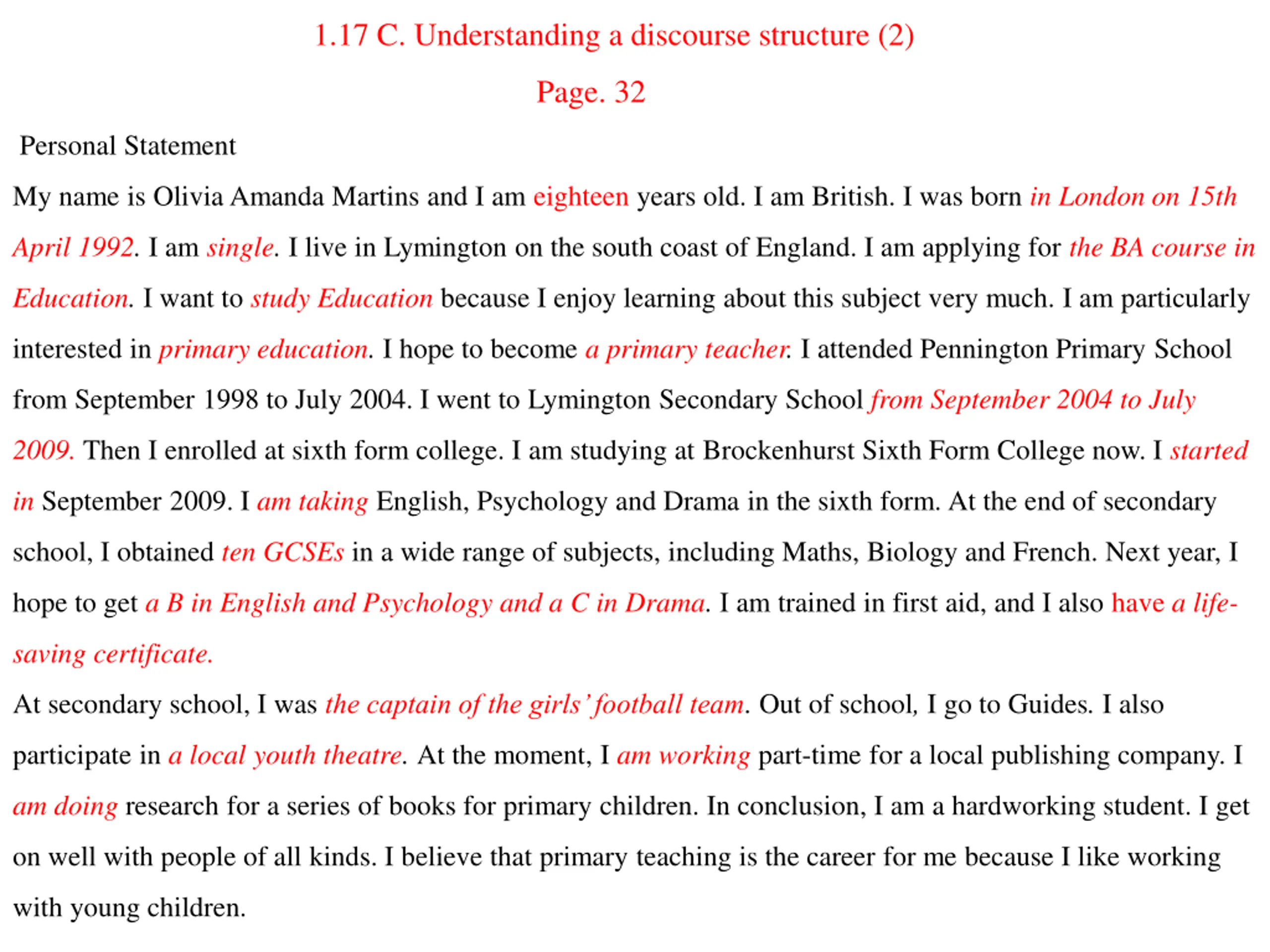 1.17 C. Understanding a discourse structure (2) Page. 32 Personal Statement My name is Olivia Amanda Martins and I am eighteen years old. I am British. I was born in London on 15th April 1992. I am single. I live in Lymington on the south coast of England. I am applying for the BA course in Education. I want to study Education because I enjoy learning about this subject very much. I am particularly interested in primary education. I hope to become a primary teacher. I attended Pennington Primary School from September 1998 to July 2004. I went to Lymington Secondary School from September 2004 to July 2009. Then I enrolled at sixth form college. I am studying at Brockenhurst Sixth Form College now. I started in September 2009. I am taking English, Psychology and Drama in the sixth form. At the end of secondary school, I obtained ten GCSEs in a wide range of subjects, including Maths, Biology and French. Next year, I hope to get a B in English and Psychology and a C in Drama. I am trained in first aid, and I also have a life- saving certificate. At secondary school, I was the captain of the girls football team. Out of school, I go to Guides. I also participate in a local youth theatre. At the moment, I am working part-time for a local publishing company. I am doing research for a series of books for primary children. In conclusion, I am a hardworking student. I get on well with people of all kinds. I believe that primary teaching is the career for me because I like working with young children.