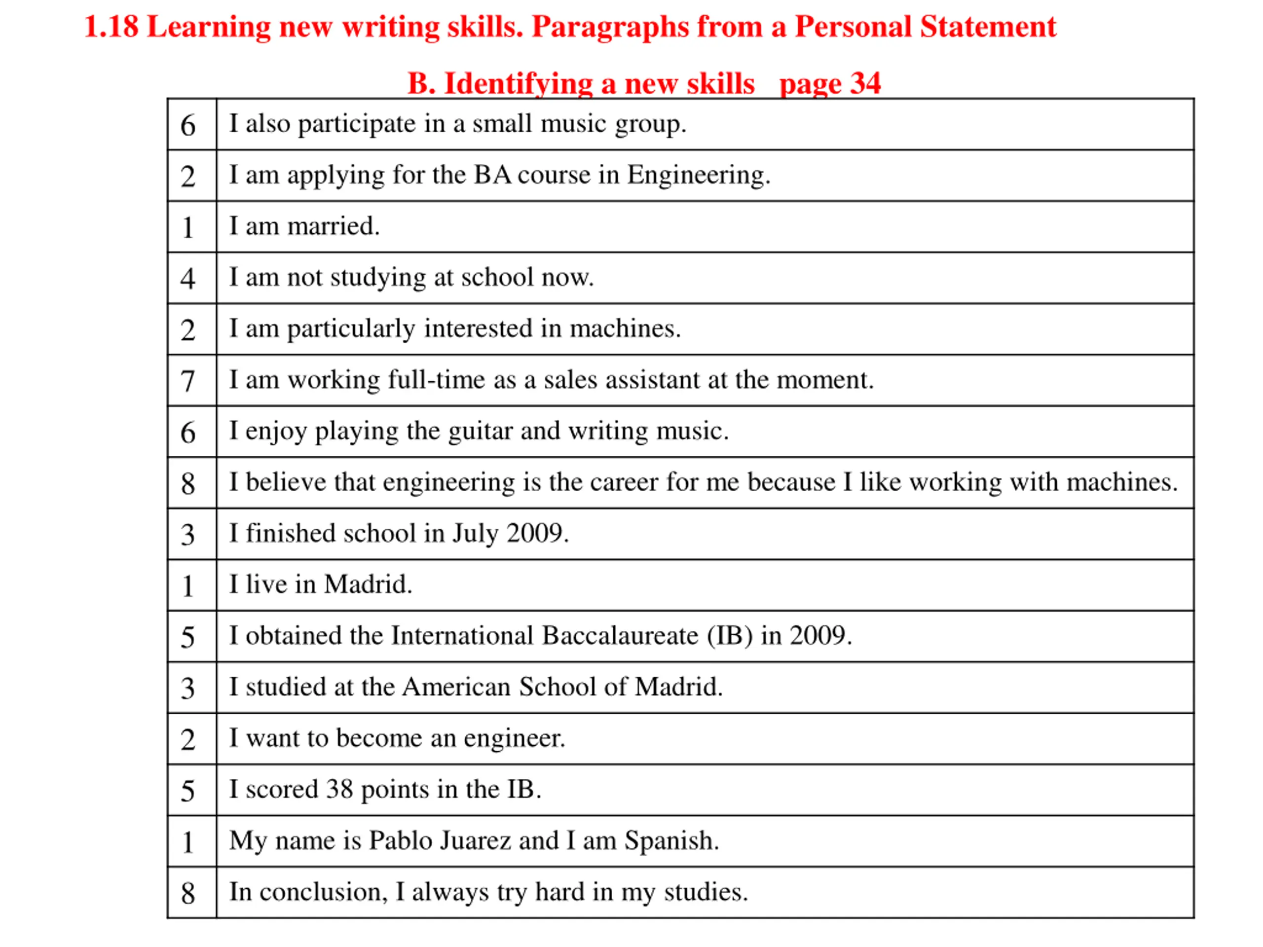 1.18 Learning new writing skills. Paragraphs from a Personal Statement B. Identifying a new skills page 34 I also participate in a small music group. 6 2 1 4 2 7 6 8 3 1 5 3 2 5 1 8 I am applying for the BA course in Engineering. I am married. I am not studying at school now. I am particularly interested in machines. I am working full-time as a sales assistant at the moment. I enjoy playing the guitar and writing music. I believe that engineering is the career for me because I like working with machines. I finished school in July 2009. I live in Madrid. I obtained the International Baccalaureate (IB) in 2009. I studied at the American School of Madrid. I want to become an engineer. I scored 38 points in the IB. My name is Pablo Juarez and I am Spanish. In conclusion, I always try hard in my studies.