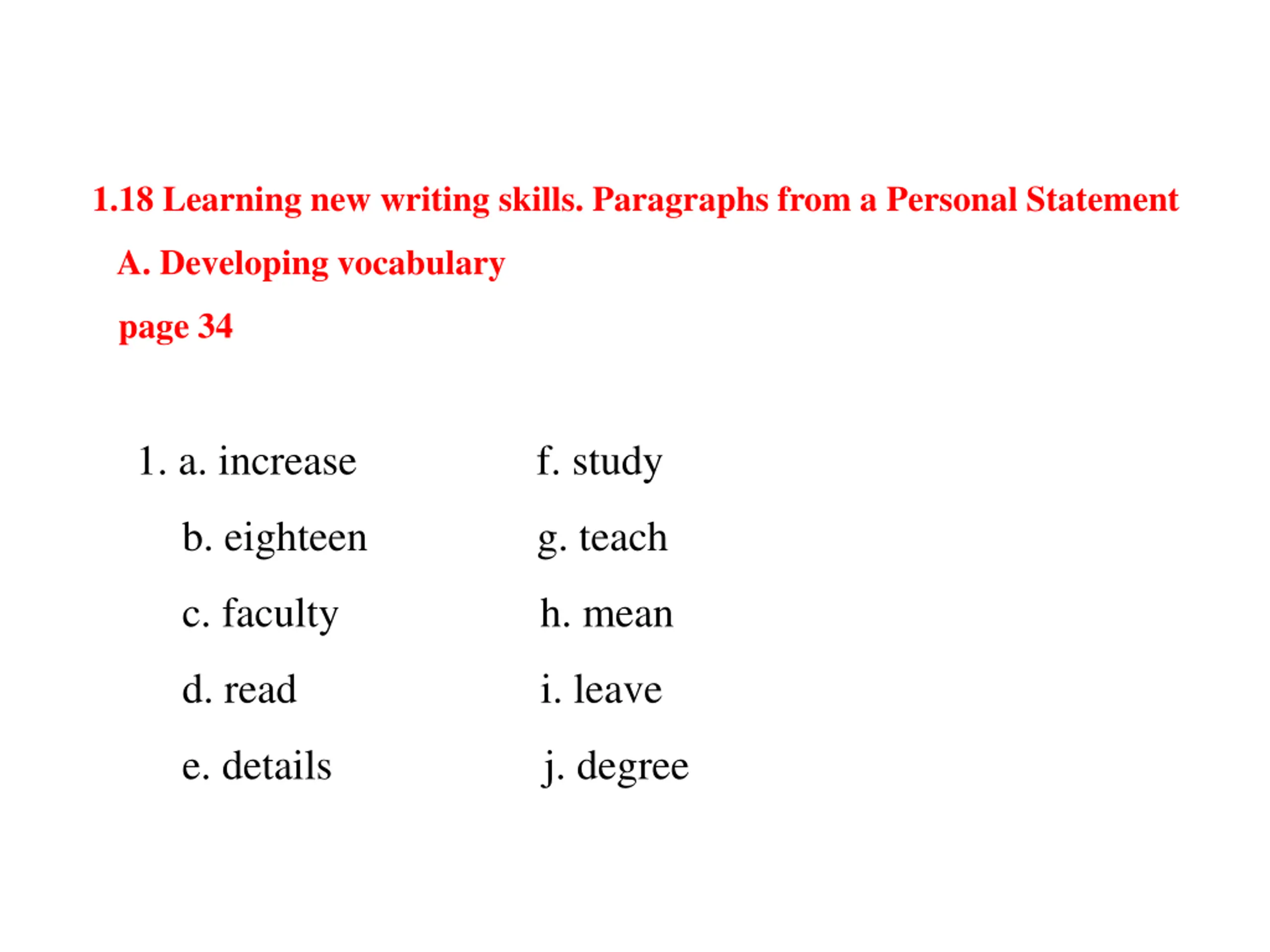 1.18 Learning new writing skills. Paragraphs from a Personal Statement A. Developing vocabulary page 34 1. a. increase f. study b. eighteen g. teach c. faculty h. mean d. read i. leave e. details j. degree