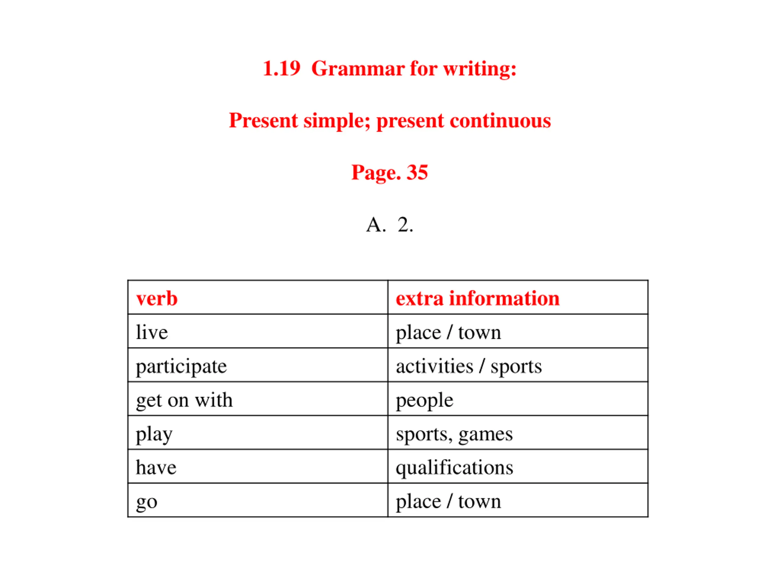 1.19 Grammar for writing: Present simple; present continuous Page. 35 A. 2. verb live participate get on with play have go extra information place / town activities / sports people sports, games qualifications place / town
