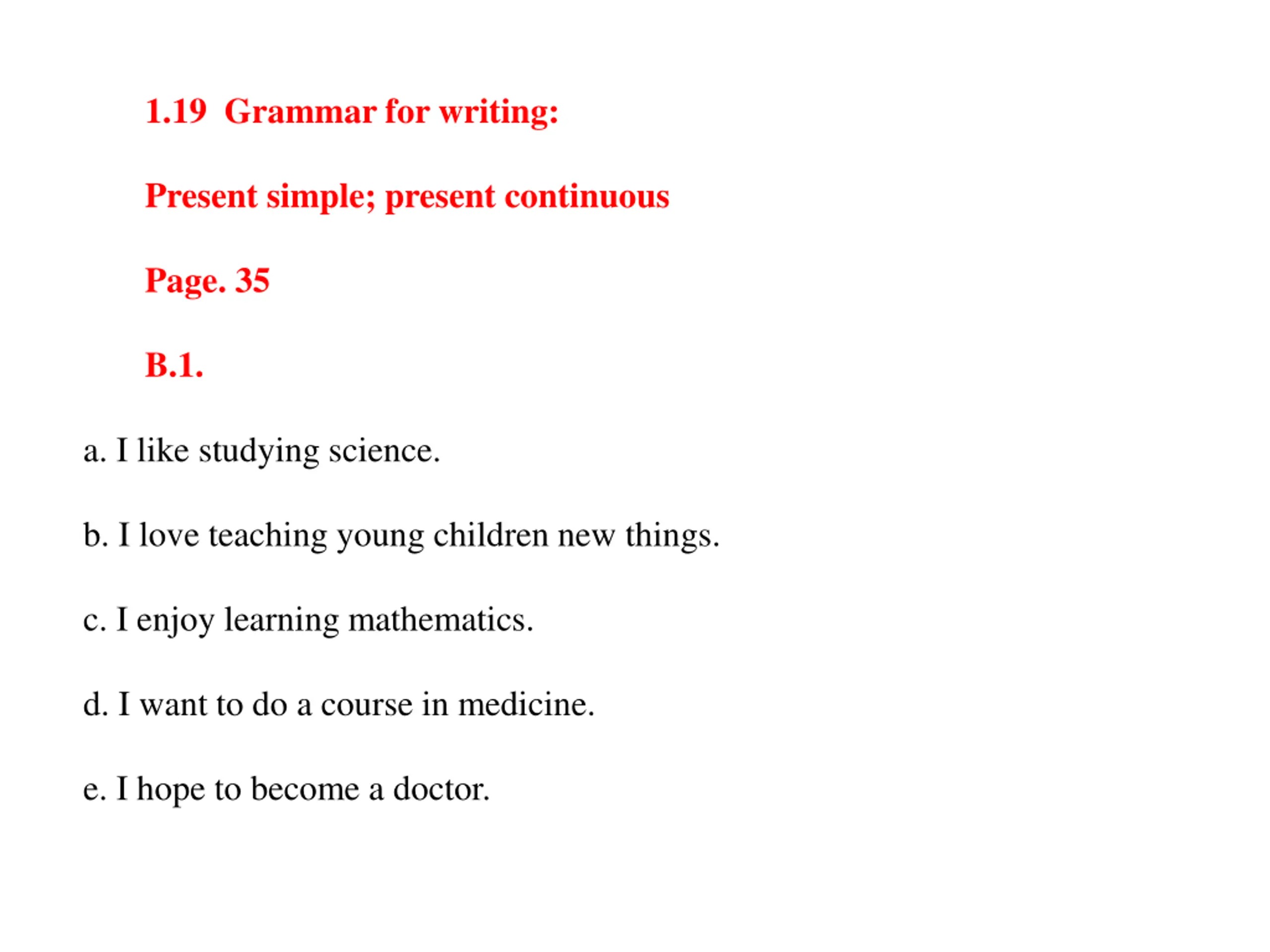 1.19 Grammar for writing: Present simple; present continuous Page. 35 B.1. a. I like studying science. b. I love teaching young children new things. c. I enjoy learning mathematics. d. I want to do a course in medicine. e. I hope to become a doctor.