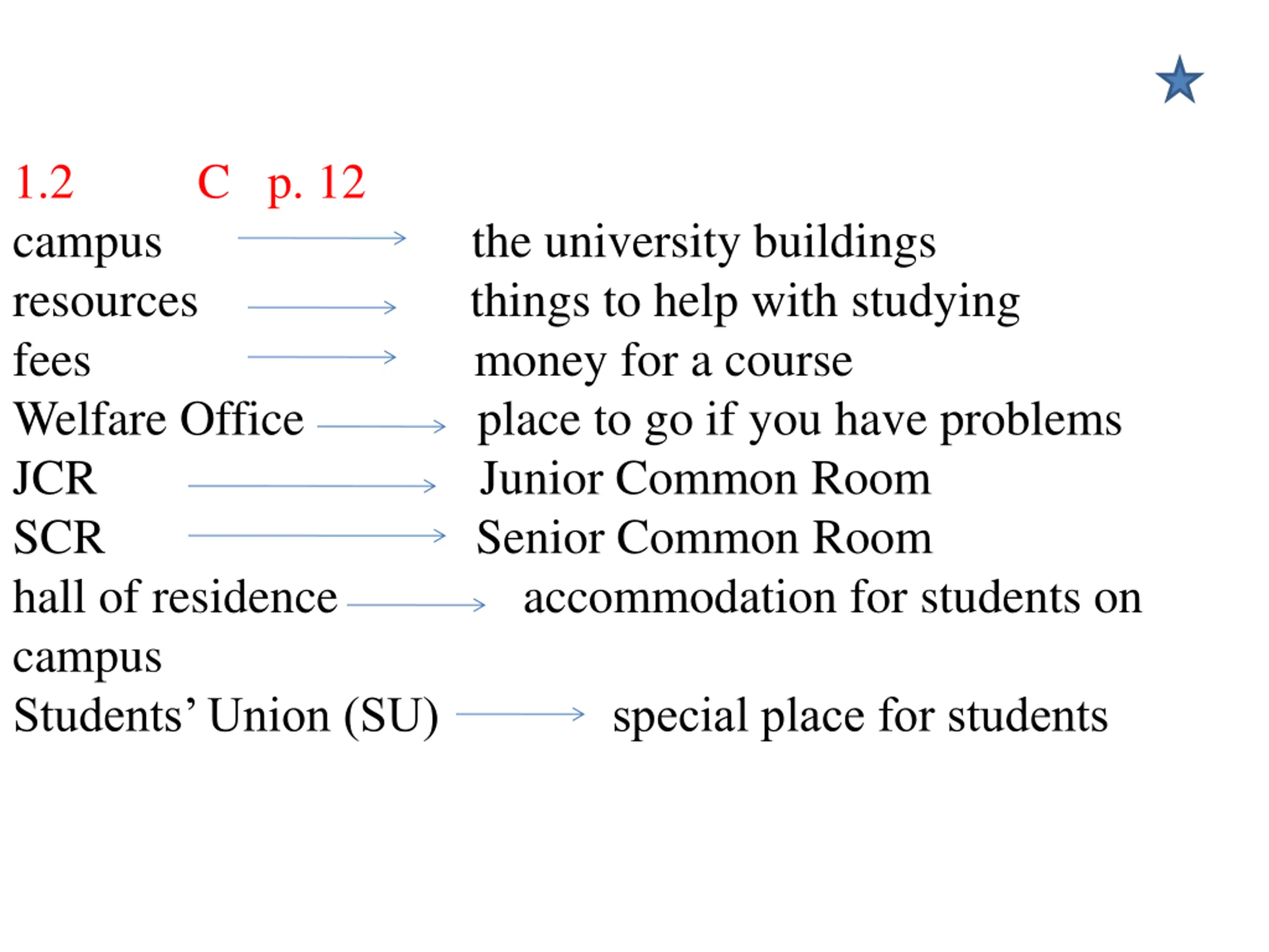 1.2 C p. 12 campus resources things to help with studying fees money for a course Welfare Office place to go if you have problems JCR Junior Common Room SCR Senior Common Room hall of residence accommodation for students on campus Students Union (SU) special place for students the university buildings