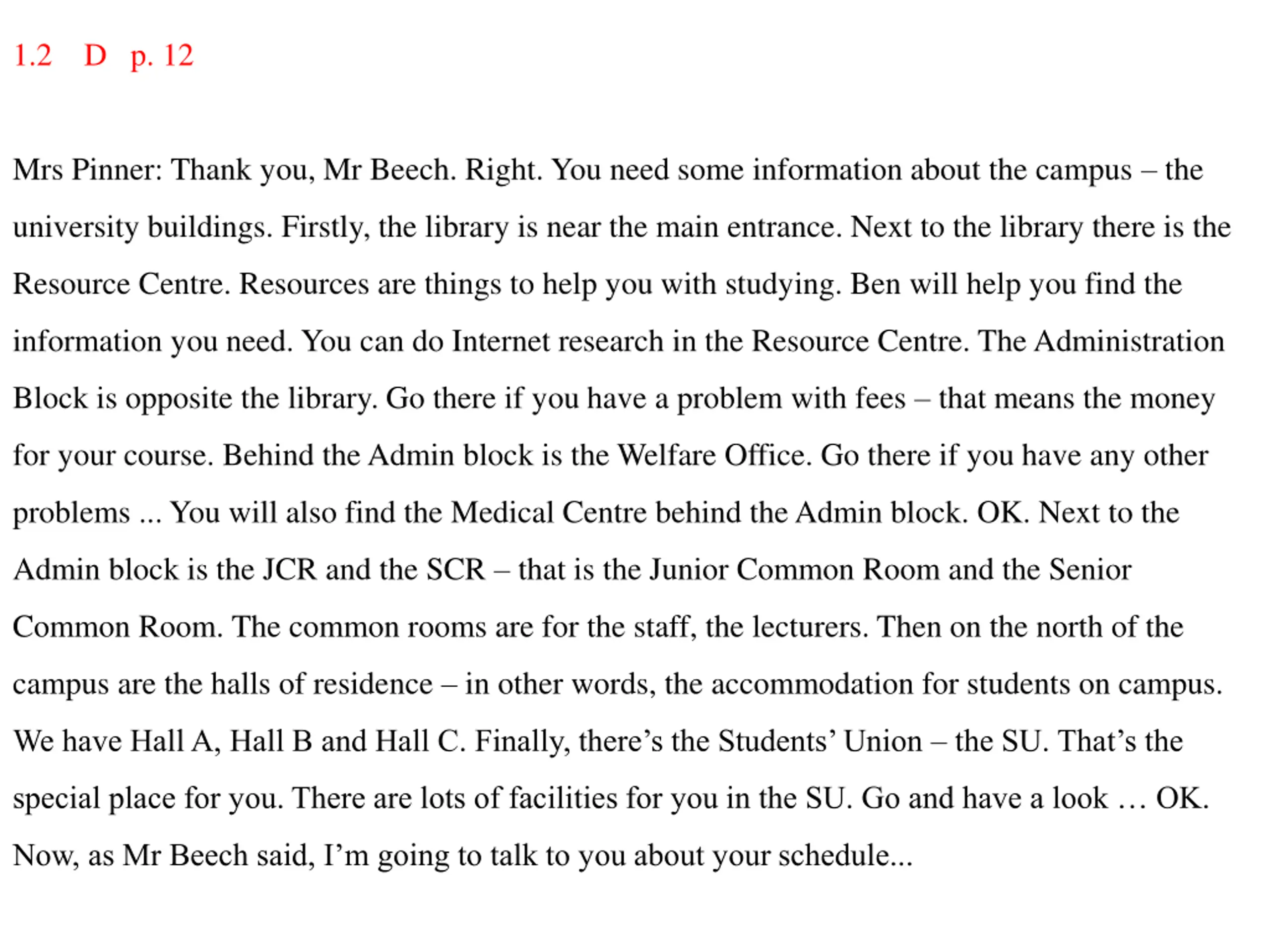 1.2 D p. 12 Mrs Pinner: Thank you, Mr Beech. Right. You need some information about the campus the university buildings. Firstly, the library is near the main entrance. Next to the library there is the Resource Centre. Resources are things to help you with studying. Ben will help you find the information you need. You can do Internet research in the Resource Centre. The Administration Block is opposite the library. Go there if you have a problem with fees that means the money for your course. Behind the Admin block is the Welfare Office. Go there if you have any other problems ... You will also find the Medical Centre behind the Admin block. OK. Next to the Admin block is the JCR and the SCR that is the Junior Common Room and the Senior Common Room. The common rooms are for the staff, the lecturers. Then on the north of the campus are the halls of residence in other words, the accommodation for students on campus. We have Hall A, Hall B and Hall C. Finally, there s the Students Union the SU. That s the special place for you. There are lots of facilities for you in the SU. Go and have a look OK. Now, as Mr Beech said, I m going to talk to you about your schedule...