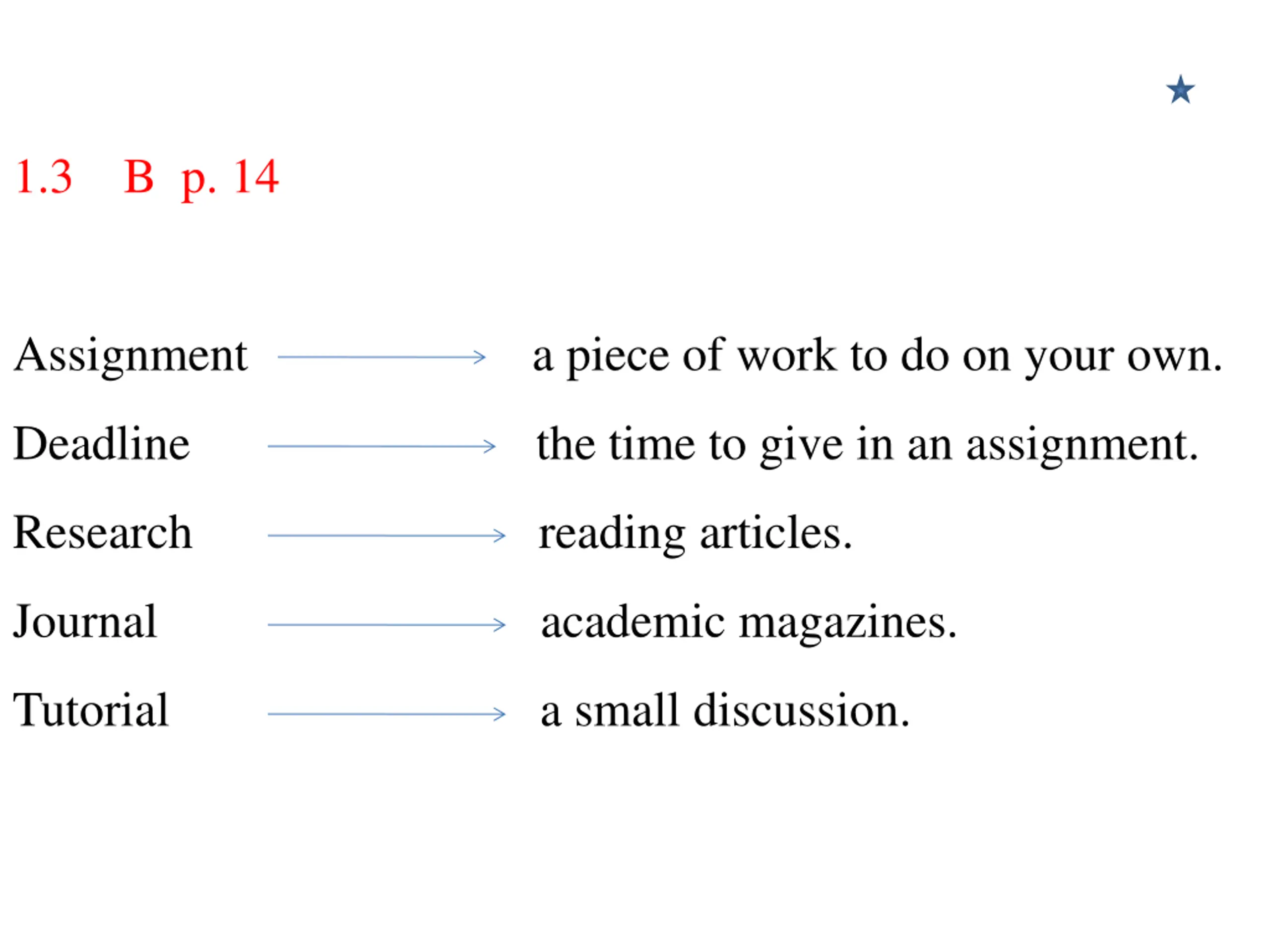 1.3 B p. 14 Assignment a piece of work to do on your own. Deadline the time to give in an assignment. Research reading articles. Journal academic magazines. Tutorial a small discussion.