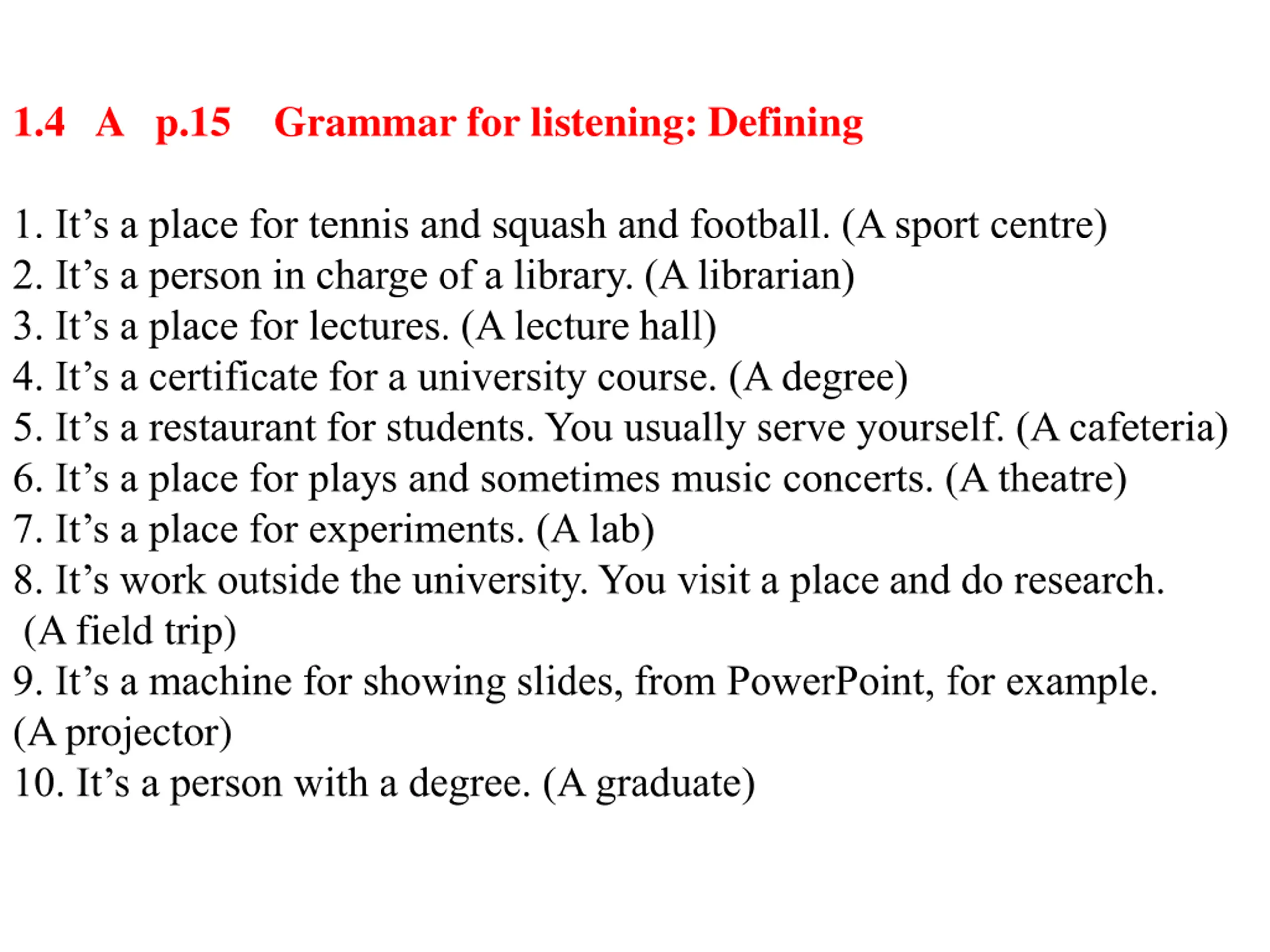1.4 A p.15 Grammar for listening: Defining 1. It s a place for tennis and squash and football. (A sport centre) 2. It s a person in charge of a library. (A librarian) 3. It s a place for lectures. (A lecture hall) 4. It s a certificate for a university course. (A degree) 5. It s a restaurant for students. You usually serve yourself. (A cafeteria) 6. It s a place for plays and sometimes music concerts. (A theatre) 7. It s a place for experiments. (A lab) 8. It s work outside the university. You visit a place and do research. (A field trip) 9. It s a machine for showing slides, from PowerPoint, for example. (A projector) 10. It s a person with a degree. (A graduate)