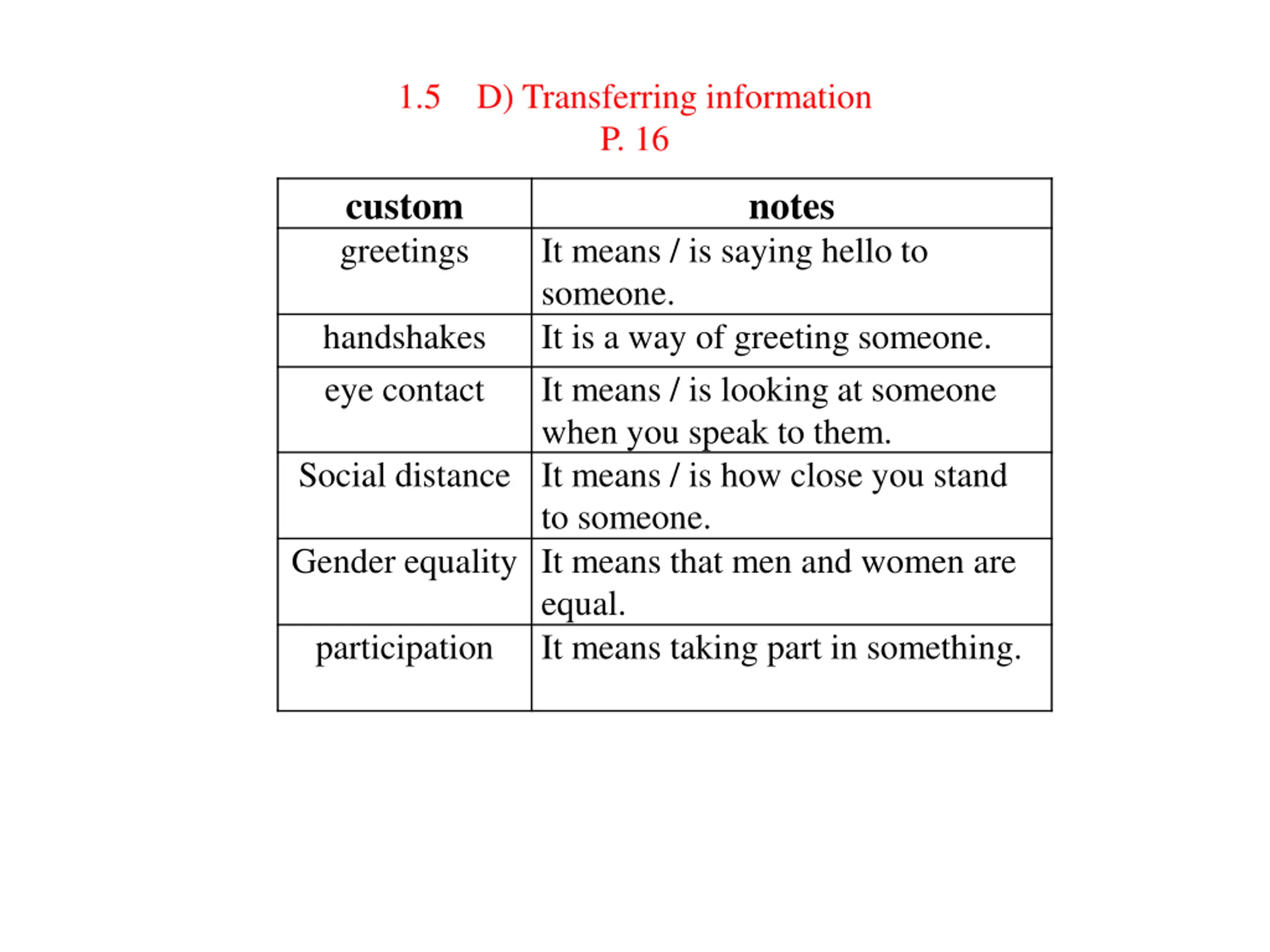 1.5 D) Transferring information P. 16 custom greetings notes It means / is saying hello to someone. It is a way of greeting someone. It means / is looking at someone when you speak to them. handshakes eye contact Social distance It means / is how close you stand to someone. Gender equality It means that men and women are equal. participation It means taking part in something.