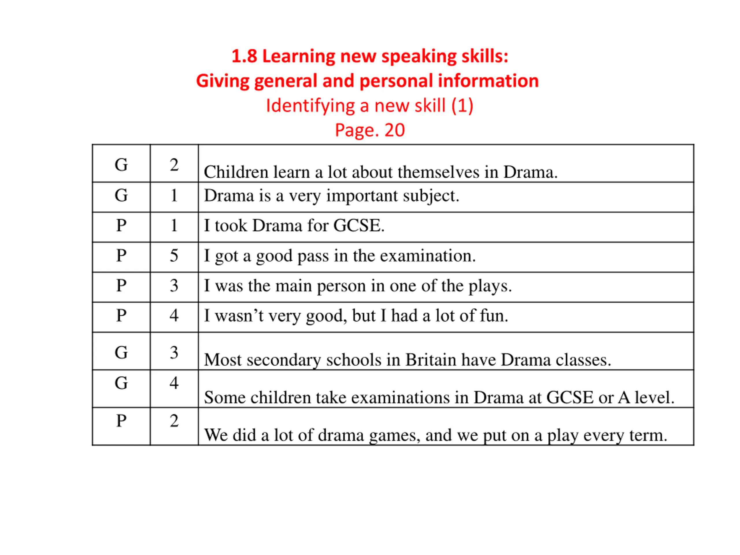 1.8 Learning new speaking skills: Giving general and personal information Identifying a new skill (1) Page. 20 G 2 Children learn a lot about themselves in Drama. Drama is a very important subject. I took Drama for GCSE. I got a good pass in the examination. I was the main person in one of the plays. G P P P P 1 1 5 3 4 I wasn t very good, but I had a lot of fun. G 3 Most secondary schools in Britain have Drama classes. G 4 Some children take examinations in Drama at GCSE or A level. P 2 We did a lot of drama games, and we put on a play every term.
