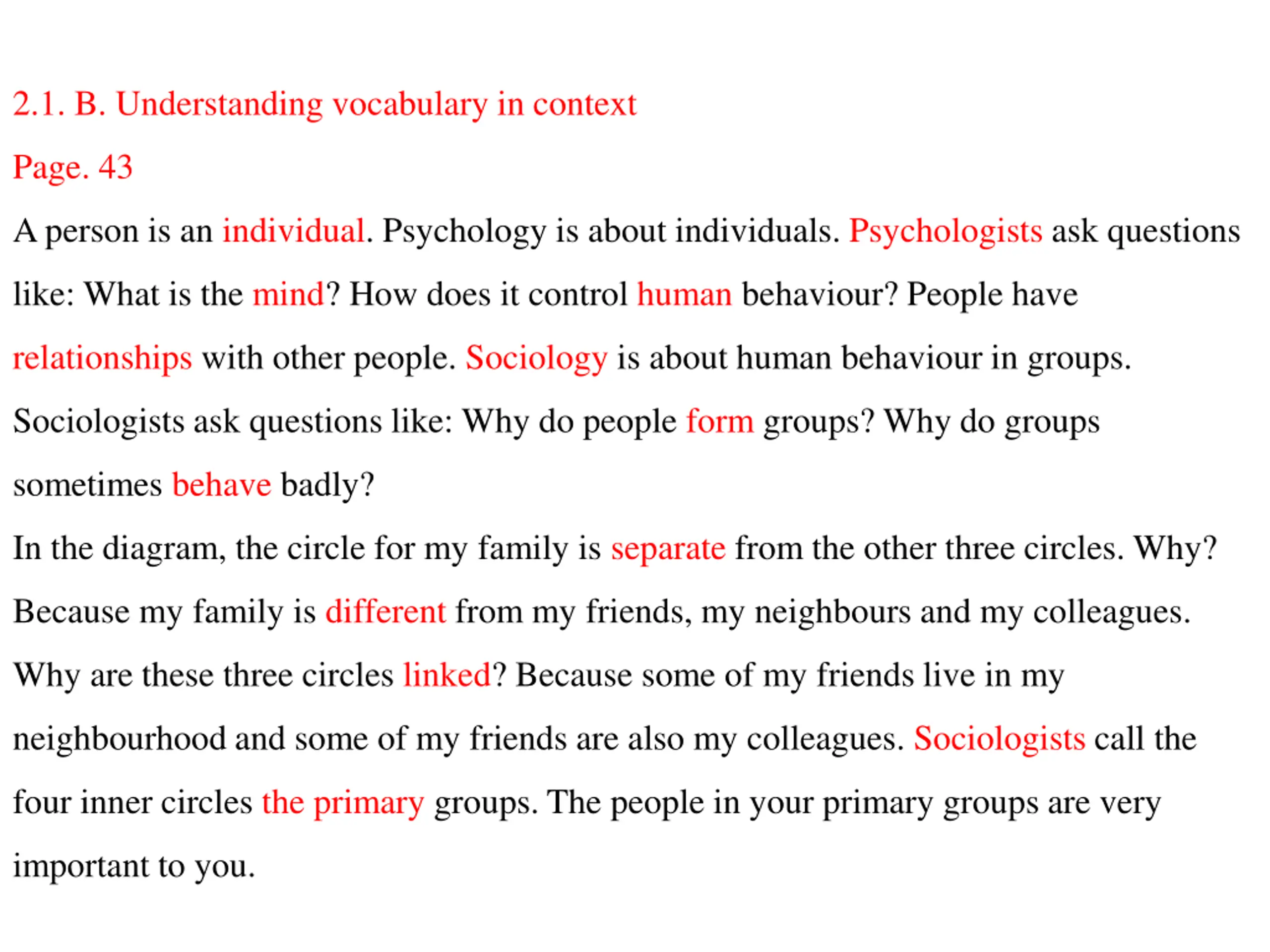 2.1. B. Understanding vocabulary in context Page. 43 A person is an individual. Psychology is about individuals. Psychologists ask questions like: What is the mind? How does it control human behaviour? People have relationships with other people. Sociology is about human behaviour in groups. Sociologists ask questions like: Why do people form groups? Why do groups sometimes behave badly? In the diagram, the circle for my family is separate from the other three circles. Why? Because my family is different from my friends, my neighbours and my colleagues. Why are these three circles linked? Because some of my friends live in my neighbourhood and some of my friends are also my colleagues. Sociologists call the four inner circles the primary groups. The people in your primary groups are very important to you.