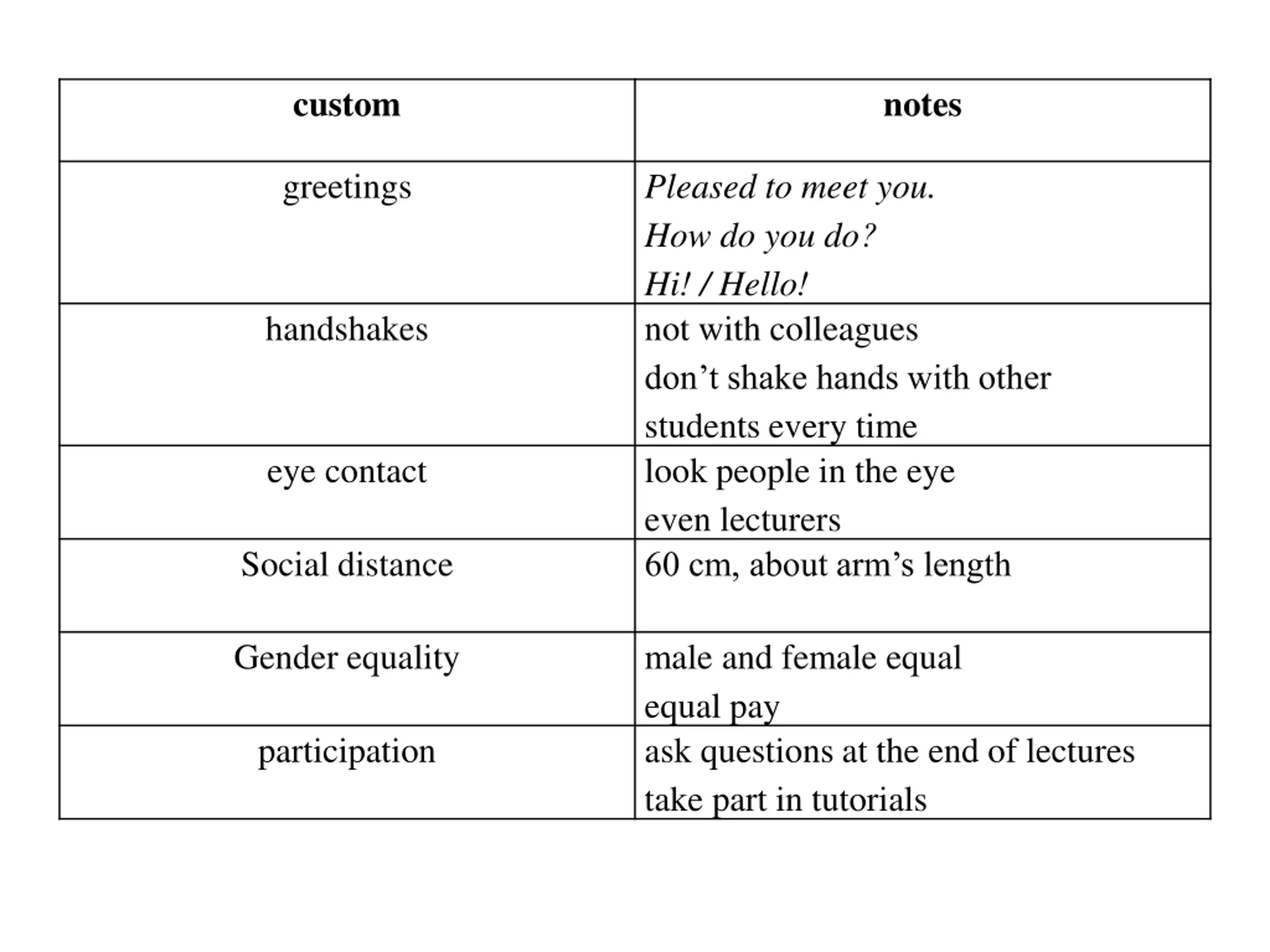 custom notes greetings Pleased to meet you. How do you do? Hi! / Hello! not with colleagues don t shake hands with other students every time look people in the eye even lecturers 60 cm, about arm s length handshakes eye contact Social distance Gender equality male and female equal equal pay ask questions at the end of lectures take part in tutorials participation