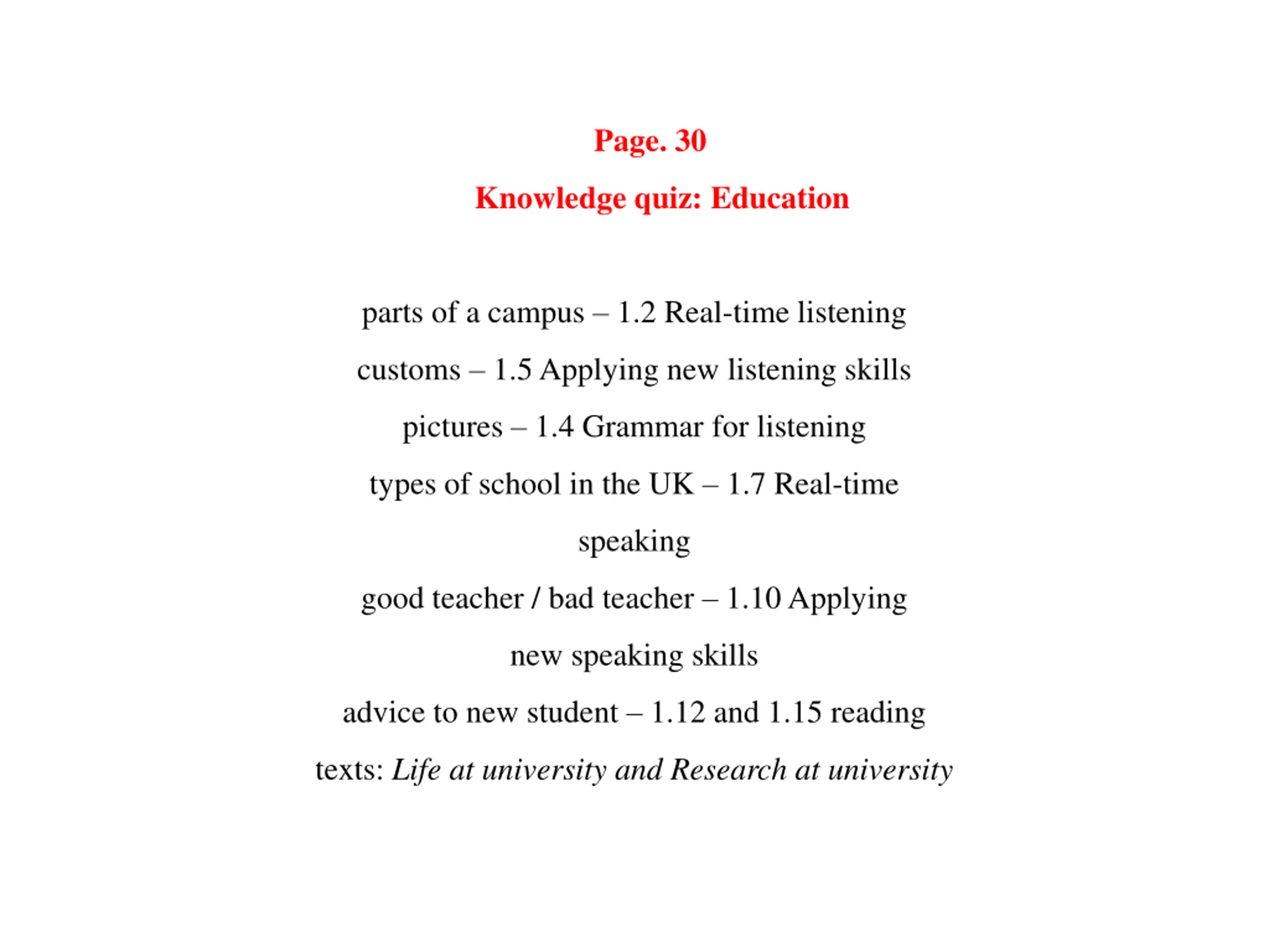 Page. 30 Knowledge quiz: Education parts of a campus 1.2 Real-time listening customs 1.5 Applying new listening skills pictures 1.4 Grammar for listening types of school in the UK 1.7 Real-time speaking good teacher / bad teacher 1.10 Applying new speaking skills advice to new student 1.12 and 1.15 reading texts: Life at university and Research at university
