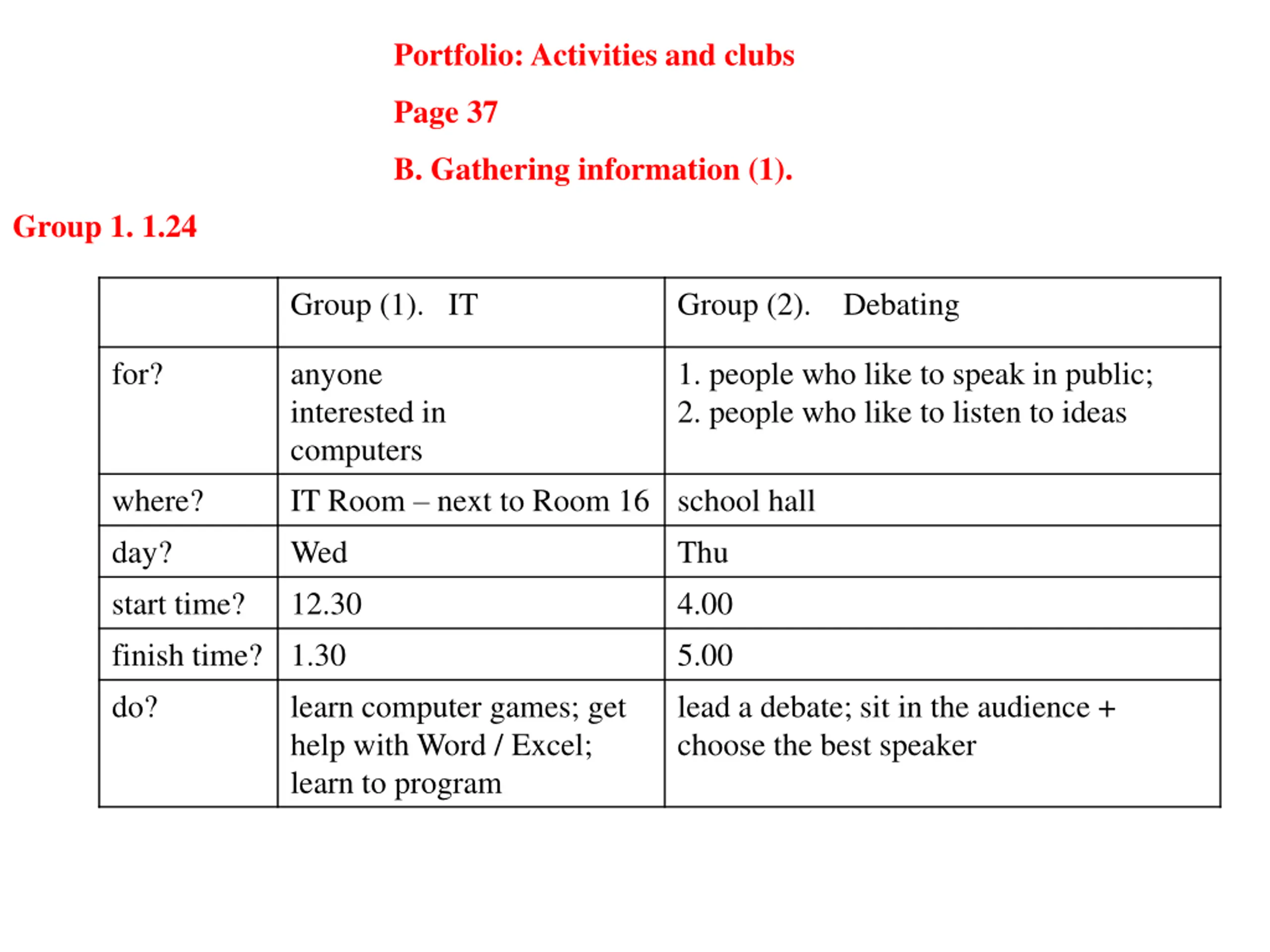 Portfolio: Activities and clubs Page 37 B. Gathering information (1). Group 1. 1.24 Group (1). IT Group (2). Debating for? anyone interested in computers IT Room next to Room 16 school hall Wed 12.30 finish time? 1.30 do? learn computer games; get help with Word / Excel; learn to program 1. people who like to speak in public; 2. people who like to listen to ideas where? day? start time? Thu 4.00 5.00 lead a debate; sit in the audience + choose the best speaker