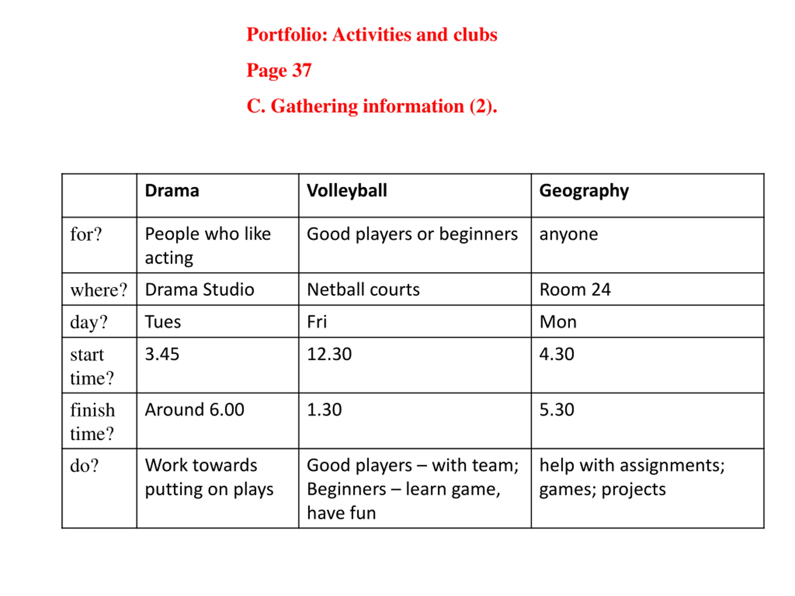 Portfolio: Activities and clubs Page 37 C. Gathering information (2). Drama Volleyball Geography for? People who like acting Good players or beginners anyone where? Drama Studio day? Tues start time? finish time? do? Work towards putting on plays Netball courts Room 24 Fri Mon 3.45 12.30 4.30 Around 6.00 1.30 5.30 Good players with team; Beginners learn game, have fun help with assignments; games; projects