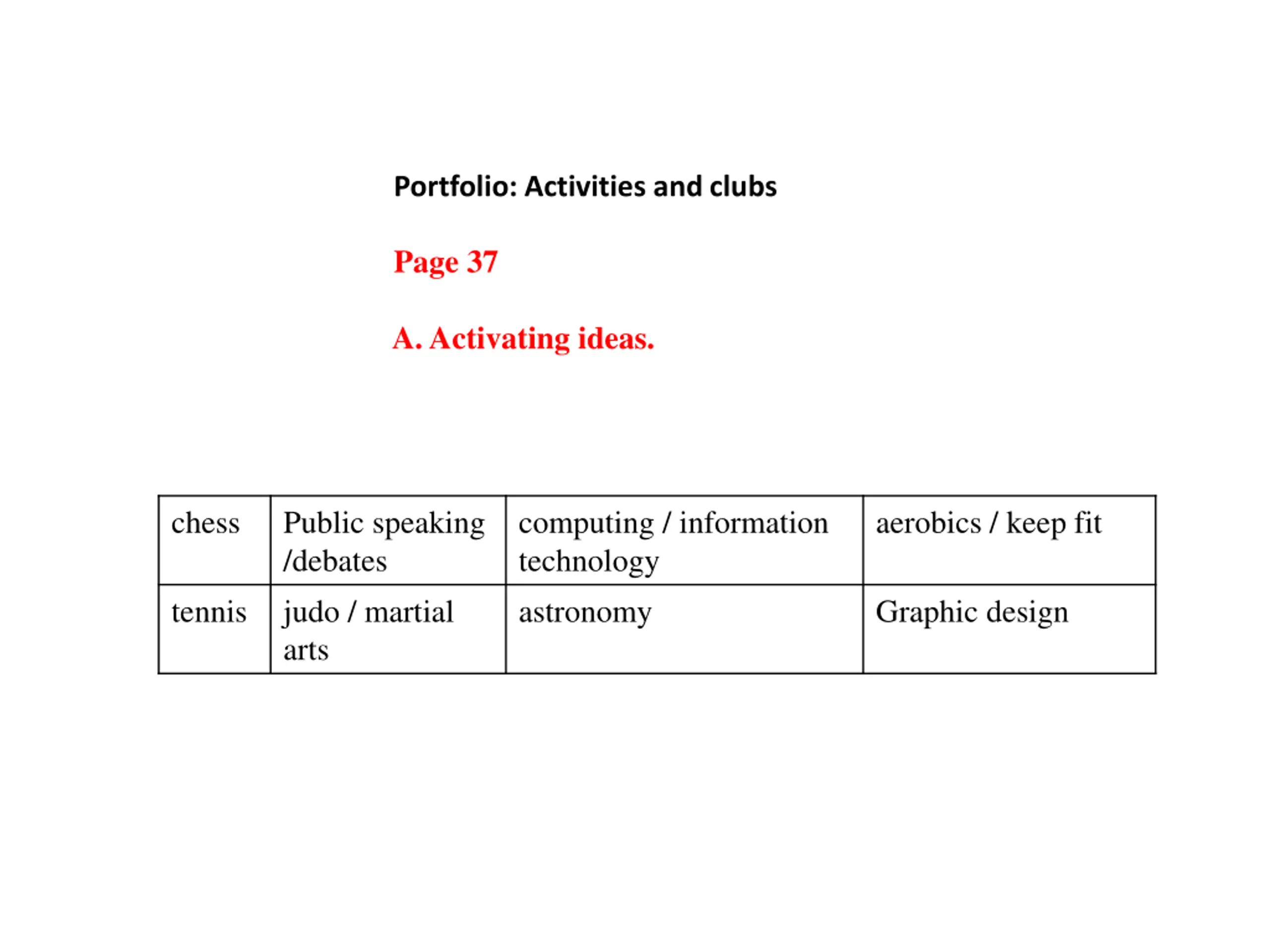 Portfolio: Activities and clubs Page 37 A. Activating ideas. chess Public speaking /debates judo / martial arts computing / information technology astronomy aerobics / keep fit tennis Graphic design