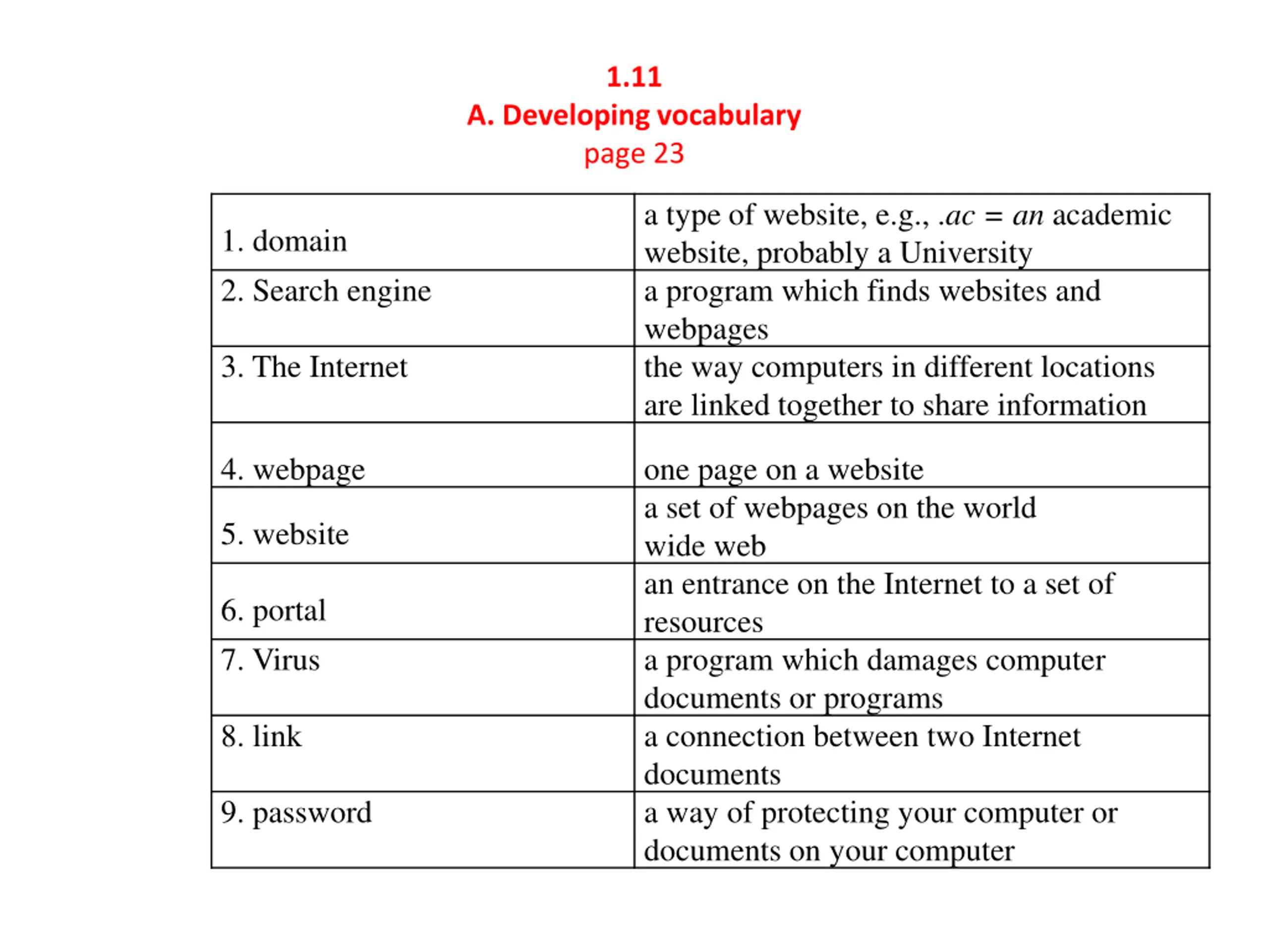 1.11 A. Developing vocabulary page 23 a type of website, e.g., .ac = an academic website, probably a University a program which finds websites and webpages the way computers in different locations are linked together to share information 1. domain 2. Search engine 3. The Internet 4. webpage one page on a website a set of webpages on the world wide web an entrance on the Internet to a set of resources a program which damages computer documents or programs a connection between two Internet documents a way of protecting your computer or documents on your computer 5. website 6. portal 7. Virus 8. link 9. password