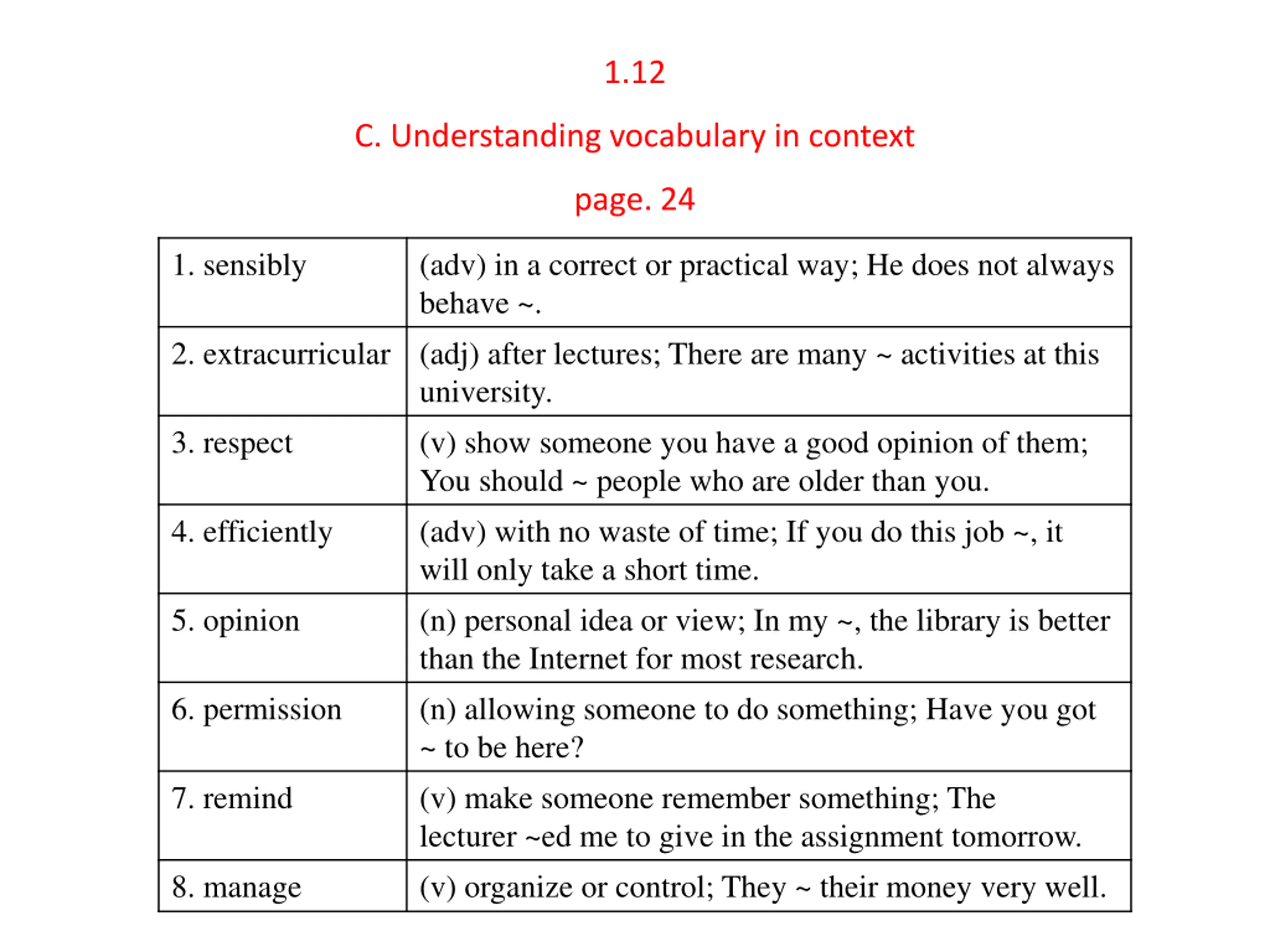 1.12 C. Understanding vocabulary in context page. 24 1. sensibly (adv) in a correct or practical way; He does not always behave ~. (adj) after lectures; There are many ~ activities at this university. (v) show someone you have a good opinion of them; You should ~ people who are older than you. (adv) with no waste of time; If you do this job ~, it will only take a short time. (n) personal idea or view; In my ~, the library is better than the Internet for most research. (n) allowing someone to do something; Have you got ~ to be here? (v) make someone remember something; The lecturer ~ed me to give in the assignment tomorrow. (v) organize or control; They ~ their money very well. 2. extracurricular 3. respect 4. efficiently 5. opinion 6. permission 7. remind 8. manage