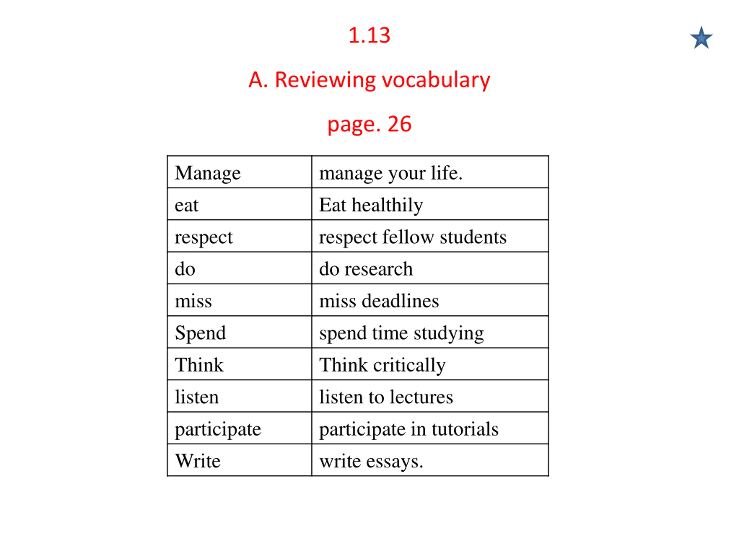 1.13 A. Reviewing vocabulary page. 26 Manage eat respect do miss Spend Think listen participate Write manage your life. Eat healthily respect fellow students do research miss deadlines spend time studying Think critically listen to lectures participate in tutorials write essays.