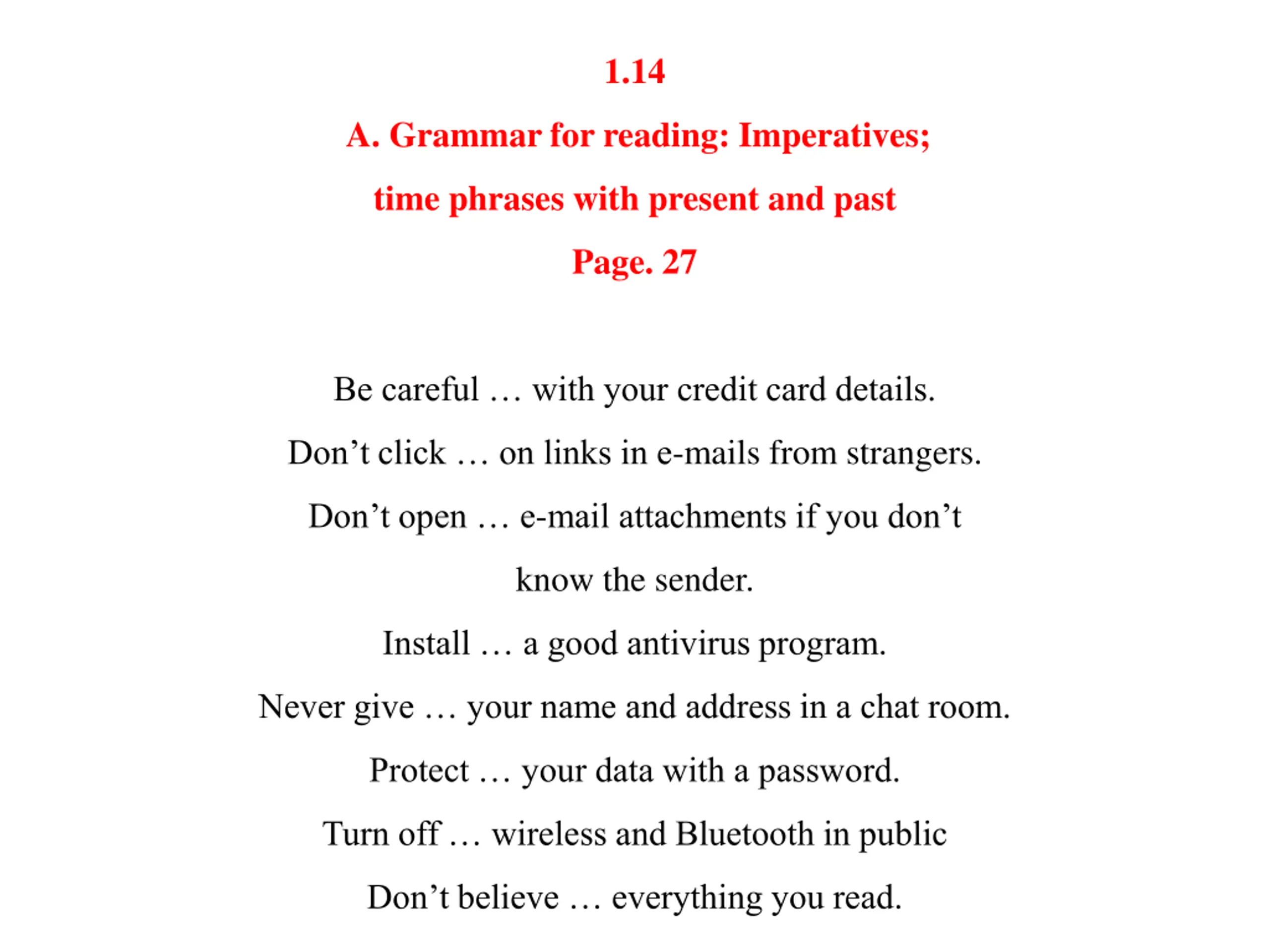 1.14 A. Grammar for reading: Imperatives; time phrases with present and past Page. 27 Be careful with your credit card details. Don t click on links in e-mails from strangers. Don t open e-mail attachments if you don t know the sender. Install a good antivirus program. Never give your name and address in a chat room. Protect your data with a password. Turn off wireless and Bluetooth in public Don t believe everything you read.