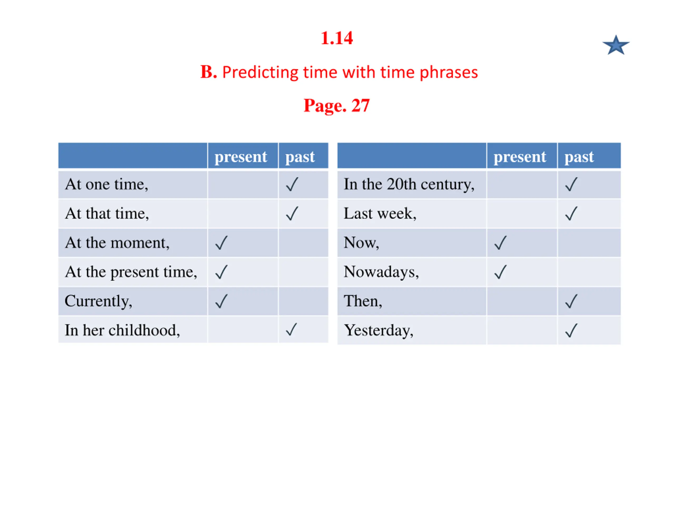 1.14 B. Predicting time with time phrases Page. 27 present past present past At one time, In the 20th century, At that time, Last week, At the moment, Now, At the present time, Nowadays, Currently, Then, In her childhood, Yesterday,