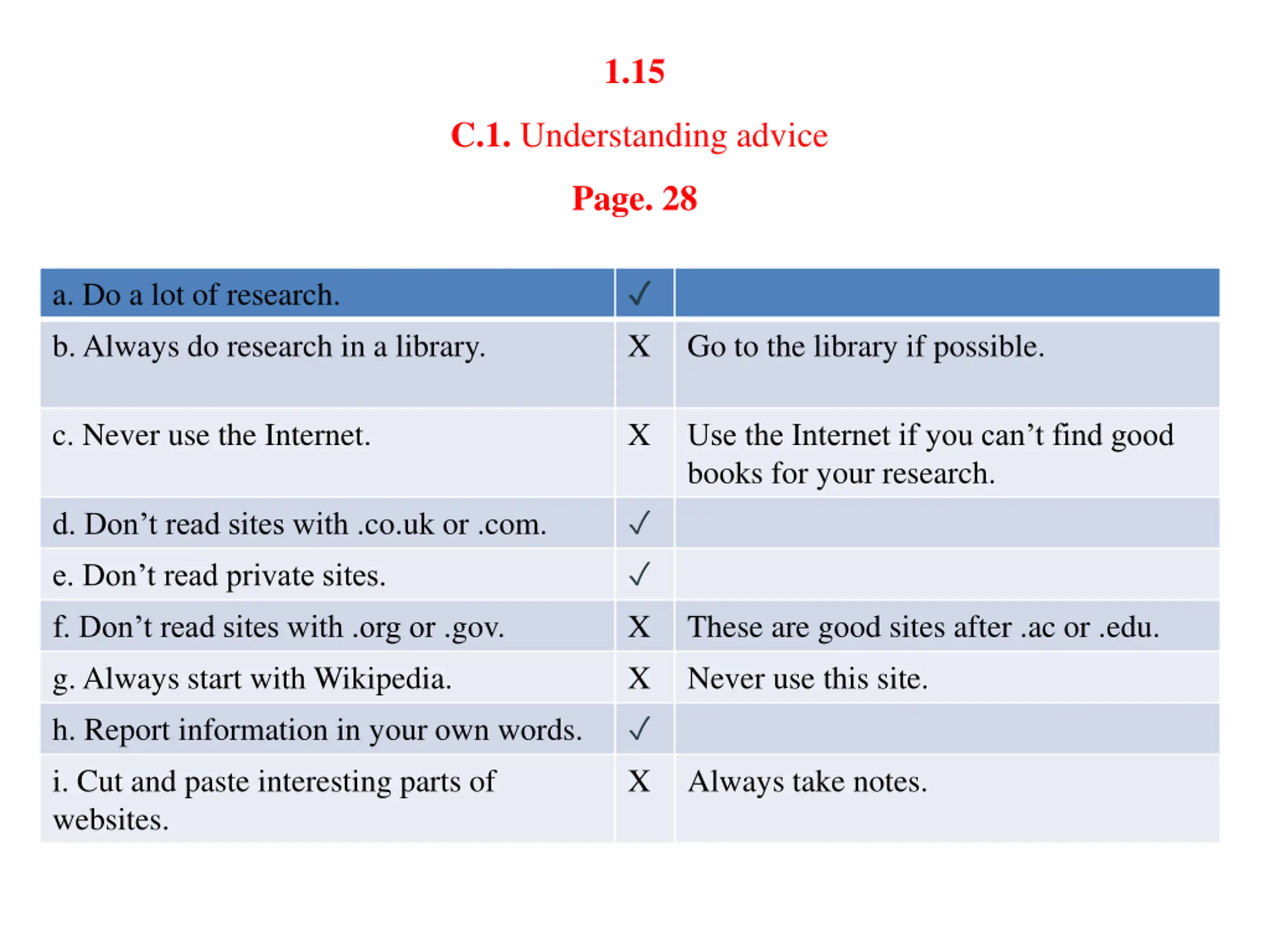 1.15 C.1. Understanding advice Page. 28 X a. Do a lot of research. b. Always do research in a library. Go to the library if possible. c. Never use the Internet. X Use the Internet if you can t find good books for your research. X X X d. Don t read sites with .co.uk or .com. e. Don t read private sites. f. Don t read sites with .org or .gov. g. Always start with Wikipedia. h. Report information in your own words. i. Cut and paste interesting parts of websites. These are good sites after .ac or .edu. Never use this site. Always take notes.