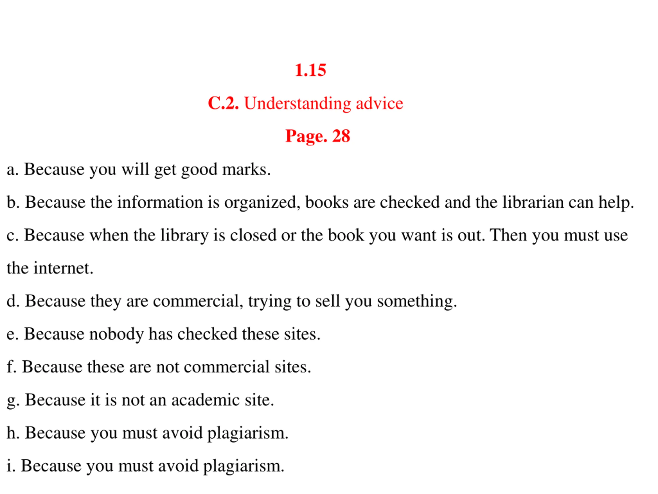 1.15 C.2. Understanding advice Page. 28 a. Because you will get good marks. b. Because the information is organized, books are checked and the librarian can help. c. Because when the library is closed or the book you want is out. Then you must use the internet. d. Because they are commercial, trying to sell you something. e. Because nobody has checked these sites. f. Because these are not commercial sites. g. Because it is not an academic site. h. Because you must avoid plagiarism. i. Because you must avoid plagiarism.