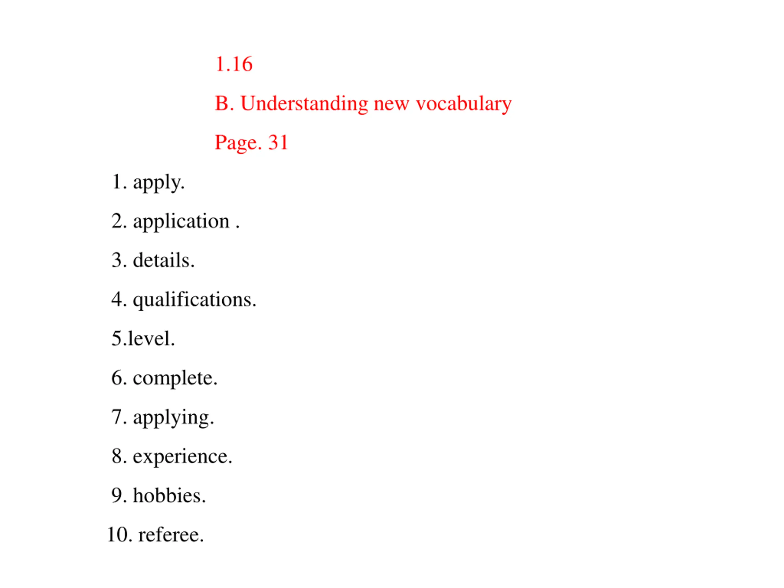 1.16 B. Understanding new vocabulary Page. 31 1. apply. 2. application . 3. details. 4. qualifications. 5.level. 6. complete. 7. applying. 8. experience. 9. hobbies. 10. referee.