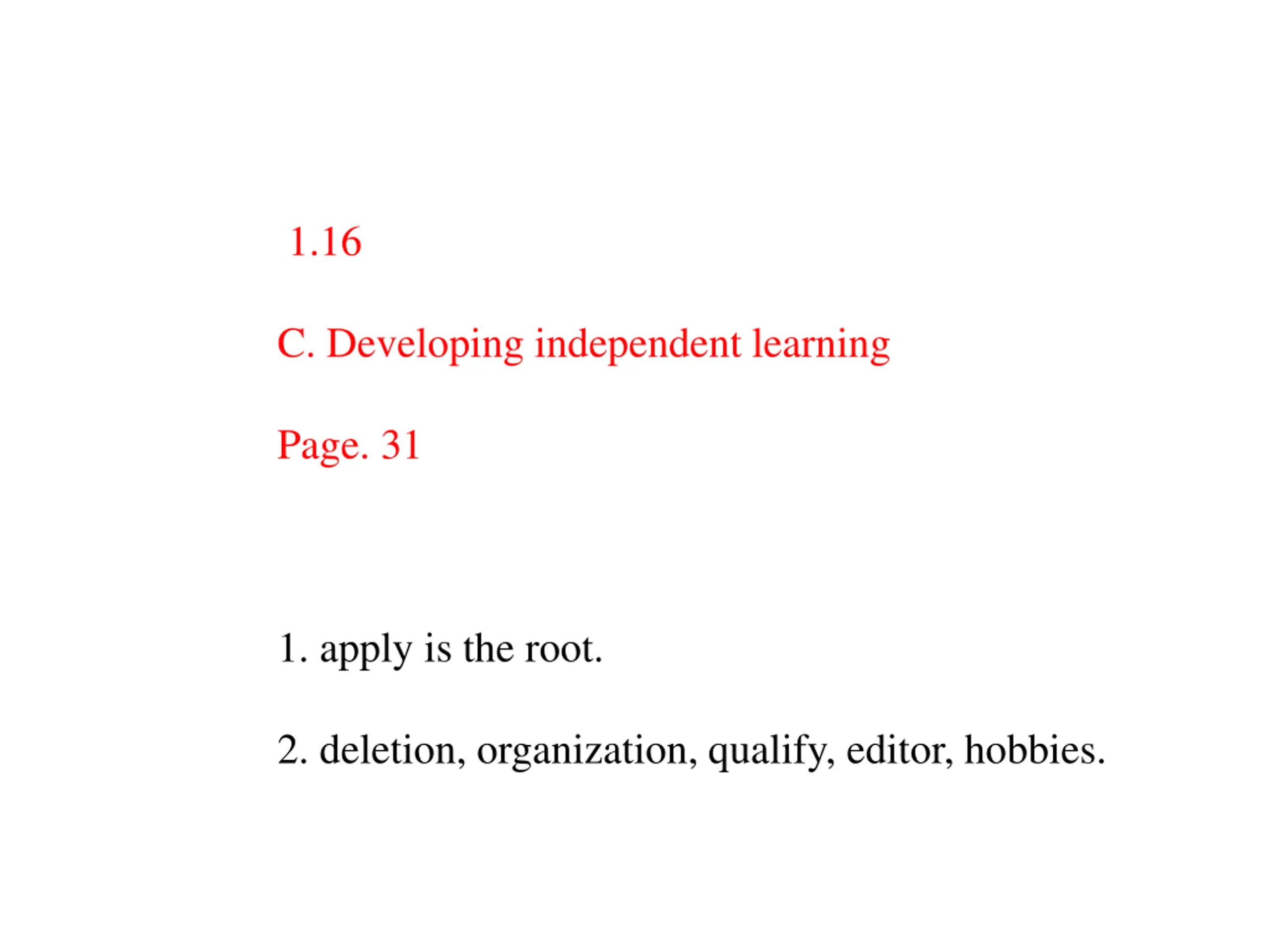 1.16 C. Developing independent learning Page. 31 1. apply is the root. 2. deletion, organization, qualify, editor, hobbies.