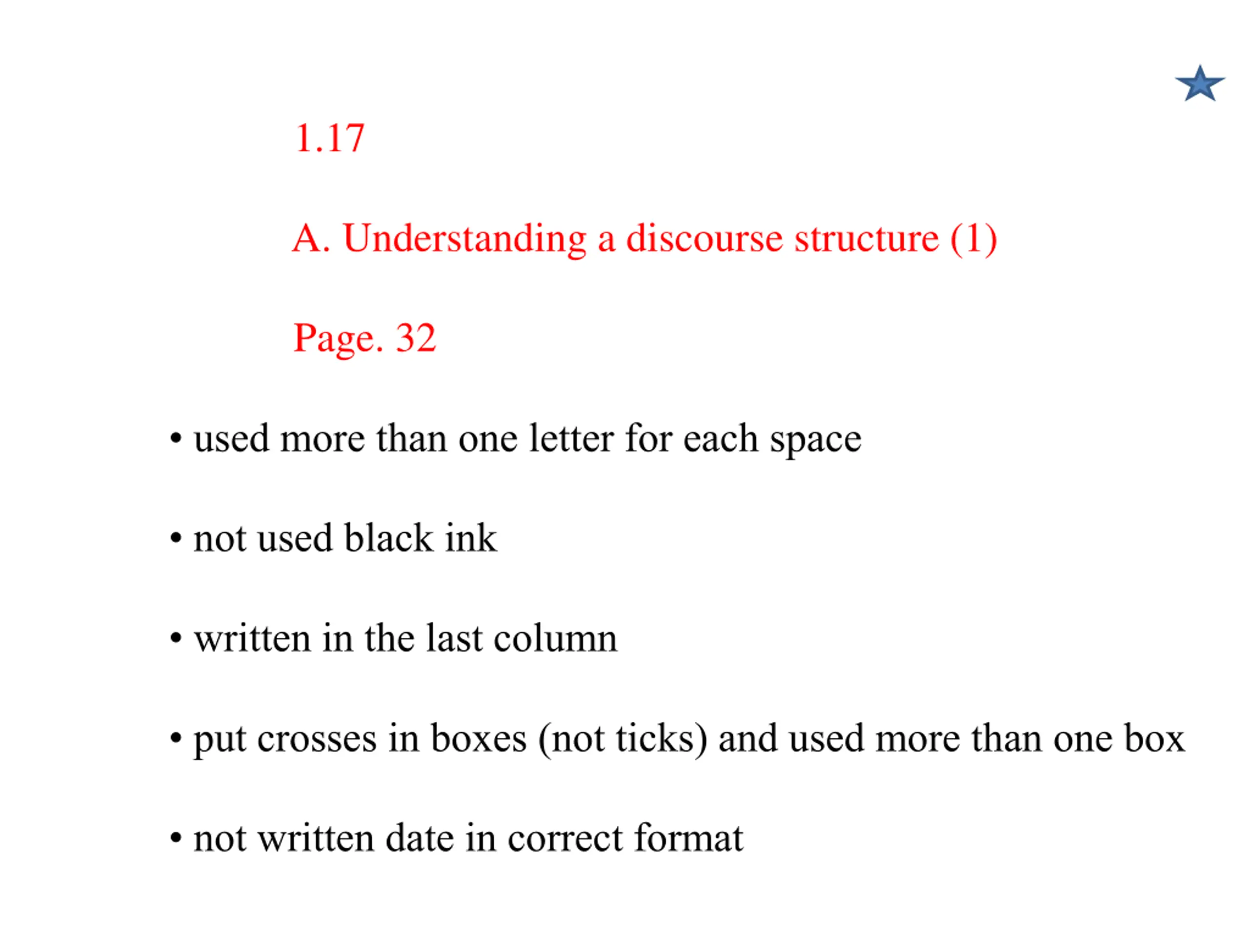 1.17 A. Understanding a discourse structure (1) Page. 32 used more than one letter for each space not used black ink written in the last column put crosses in boxes (not ticks) and used more than one box not written date in correct format