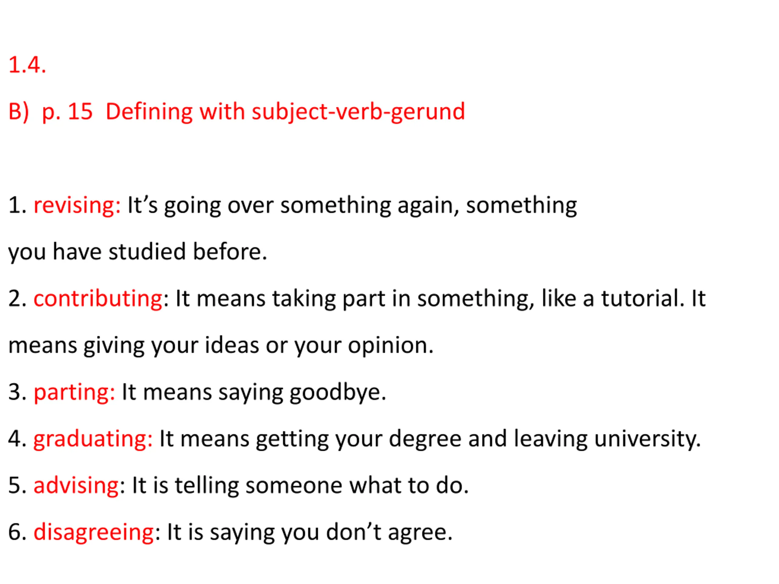 1.4. B) p. 15 Defining with subject-verb-gerund 1. revising: It s going over something again, something you have studied before. 2. contributing: It means taking part in something, like a tutorial. It means giving your ideas or your opinion. 3. parting: It means saying goodbye. 4. graduating: It means getting your degree and leaving university. 5. advising: It is telling someone what to do. 6. disagreeing: It is saying you don t agree.