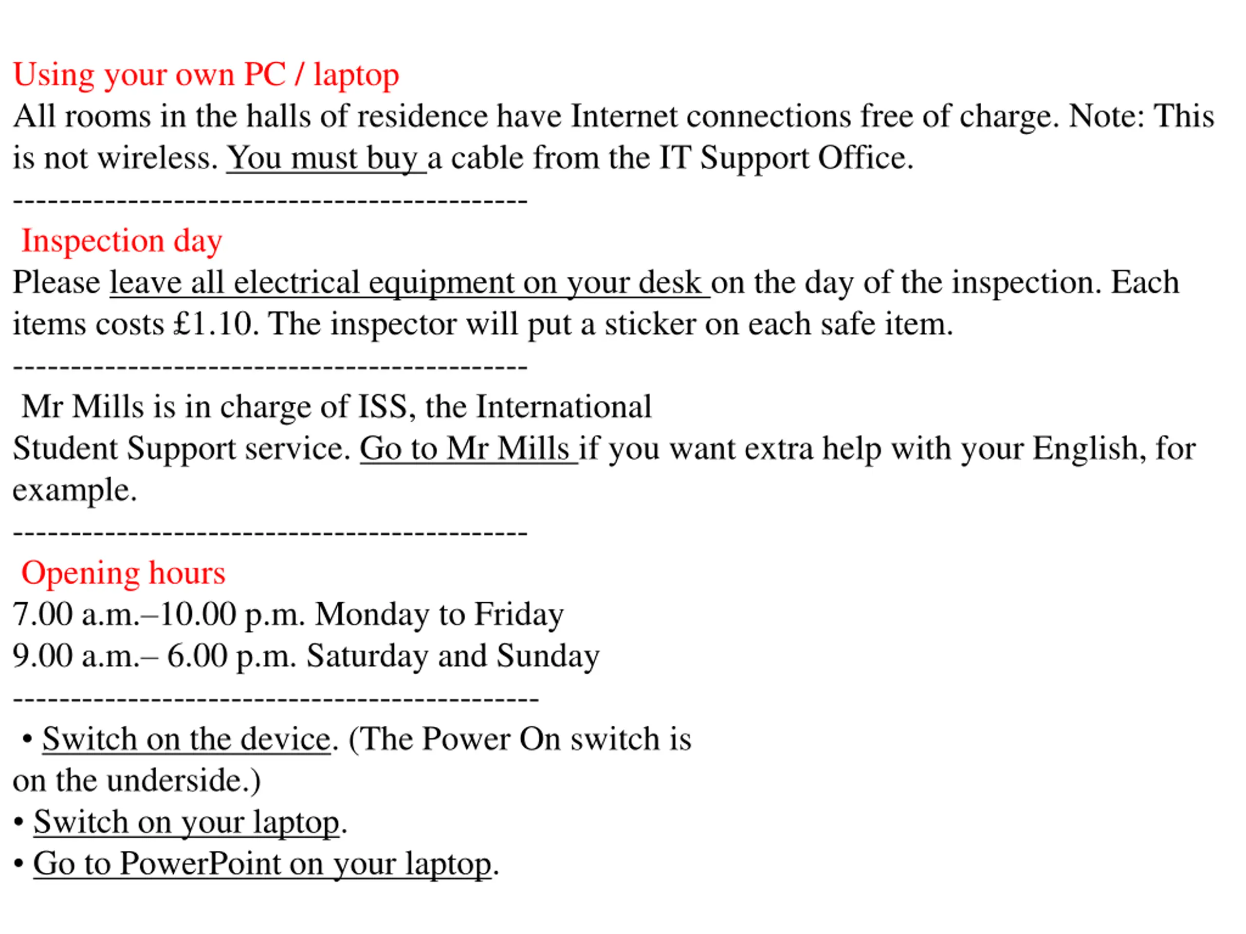 Using your own PC / laptop All rooms in the halls of residence have Internet connections free of charge. Note: This is not wireless. You must buy a cable from the IT Support Office. --------------------------------------------- Inspection day Please leave all electrical equipment on your desk on the day of the inspection. Each items costs 1.10. The inspector will put a sticker on each safe item. --------------------------------------------- Mr Mills is in charge of ISS, the International Student Support service. Go to Mr Mills if you want extra help with your English, for example. --------------------------------------------- Opening hours 7.00 a.m. 10.00 p.m. Monday to Friday 9.00 a.m. 6.00 p.m. Saturday and Sunday ---------------------------------------------- Switch on the device. (The Power On switch is on the underside.) Switch on your laptop. Go to PowerPoint on your laptop.