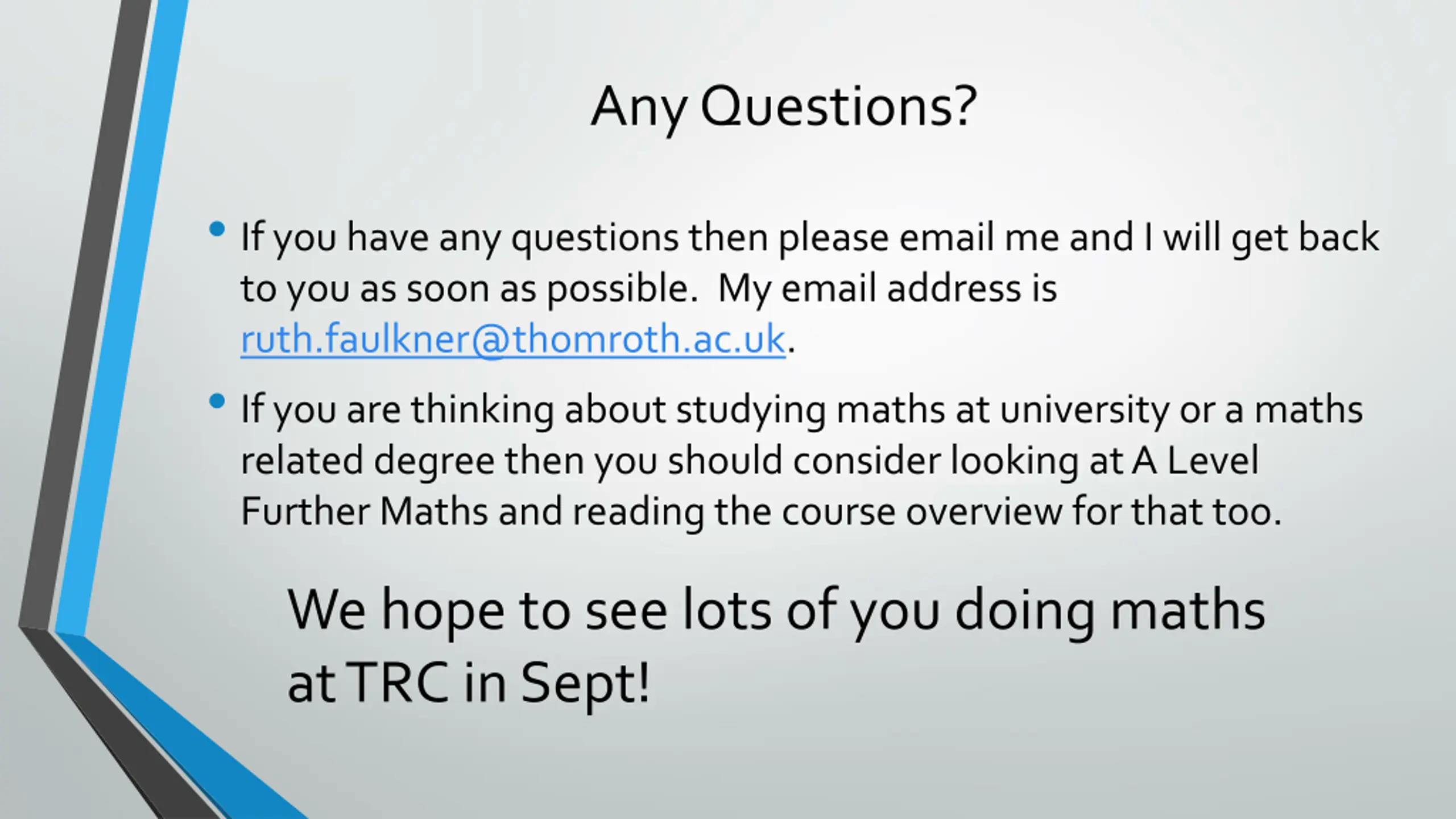 Any Questions? If you have any questions then please email me and I will get back to you as soon as possible. My email address is ruth.faulkner@thomroth.ac.uk. If you are thinking about studying maths at university or a maths related degree then you should consider looking at A Level Further Maths and reading the course overview for that too. We hope to see lots of you doing maths at TRC in Sept!