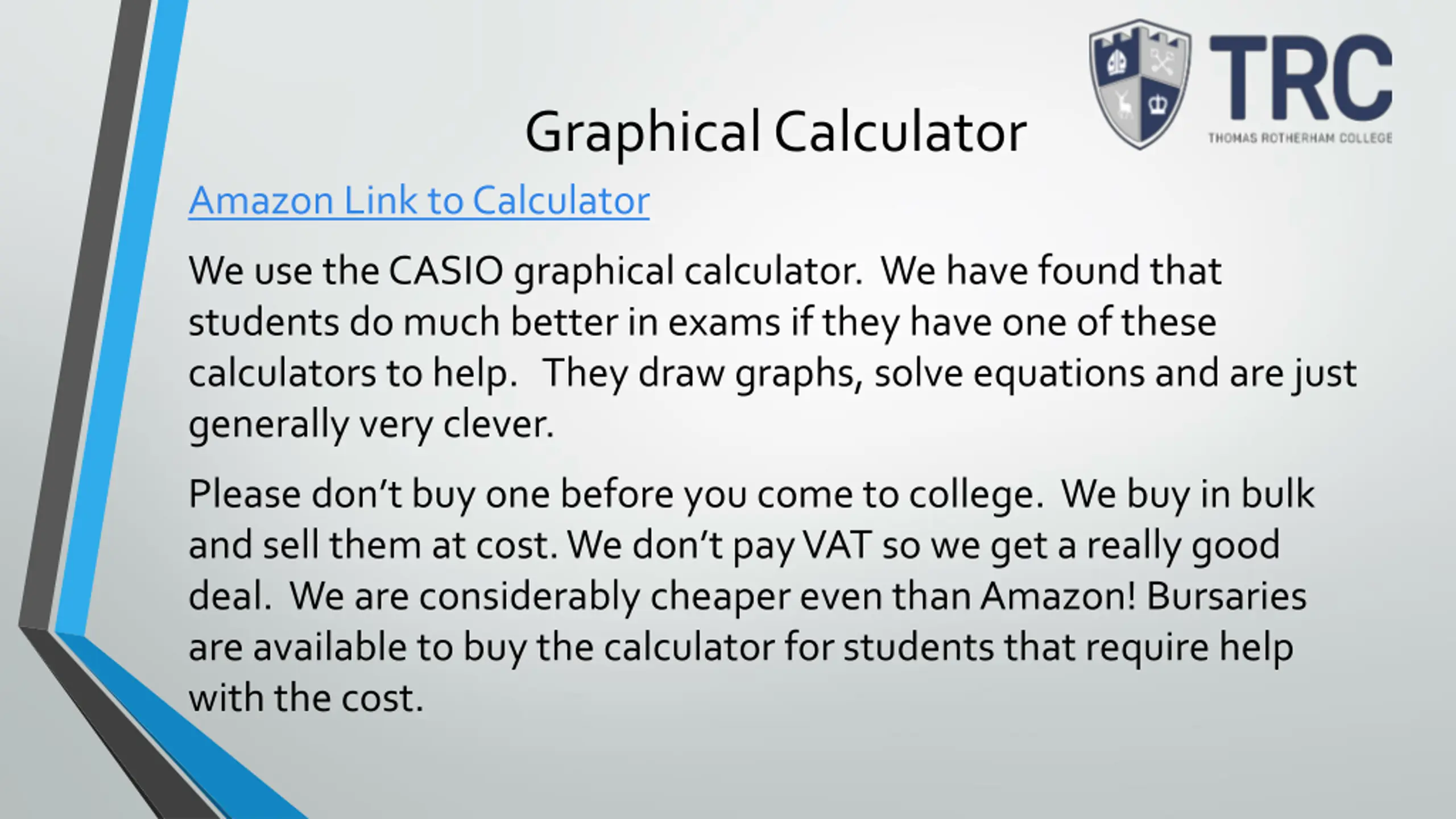 Graphical Calculator Amazon Link to Calculator We use the CASIO graphical calculator. We have found that students do much better in exams if they have one of these calculators to help. They draw graphs, solve equations and are just generally very clever. Please don t buy one before you come to college. We buy in bulk and sell them at cost. We don t pay VAT so we get a really good deal. We are considerably cheaper even than Amazon! Bursaries are available to buy the calculator for students that require help with the cost.