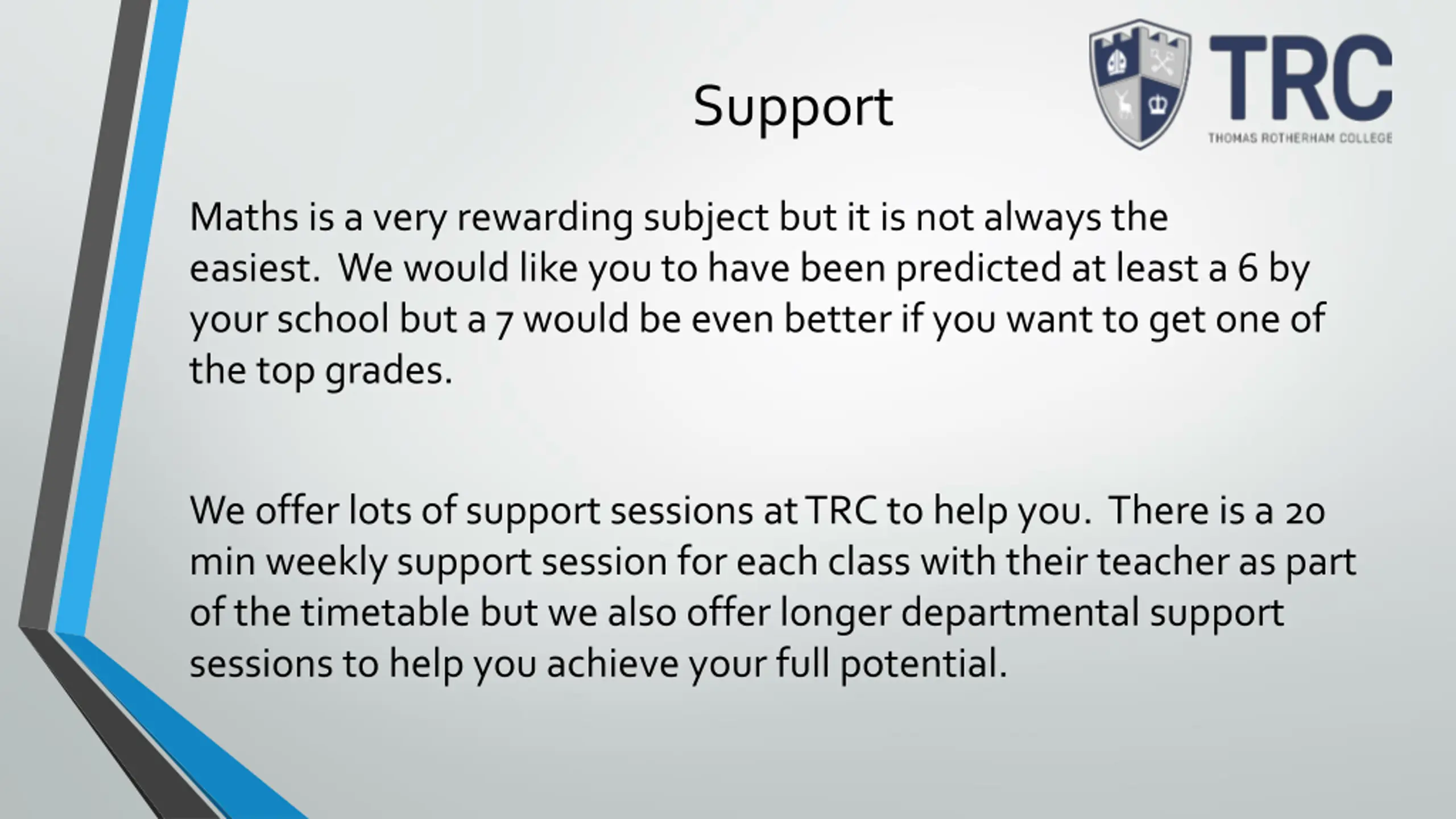 Support Maths is a very rewarding subject but it is not always the easiest. We would like you to have been predicted at least a 6 by your school but a 7 would be even better if you want to get one of the top grades. We offer lots of support sessions at TRC to help you. There is a 20 min weekly support session for each class with their teacher as part of the timetable but we also offer longer departmental support sessions to help you achieve your full potential.