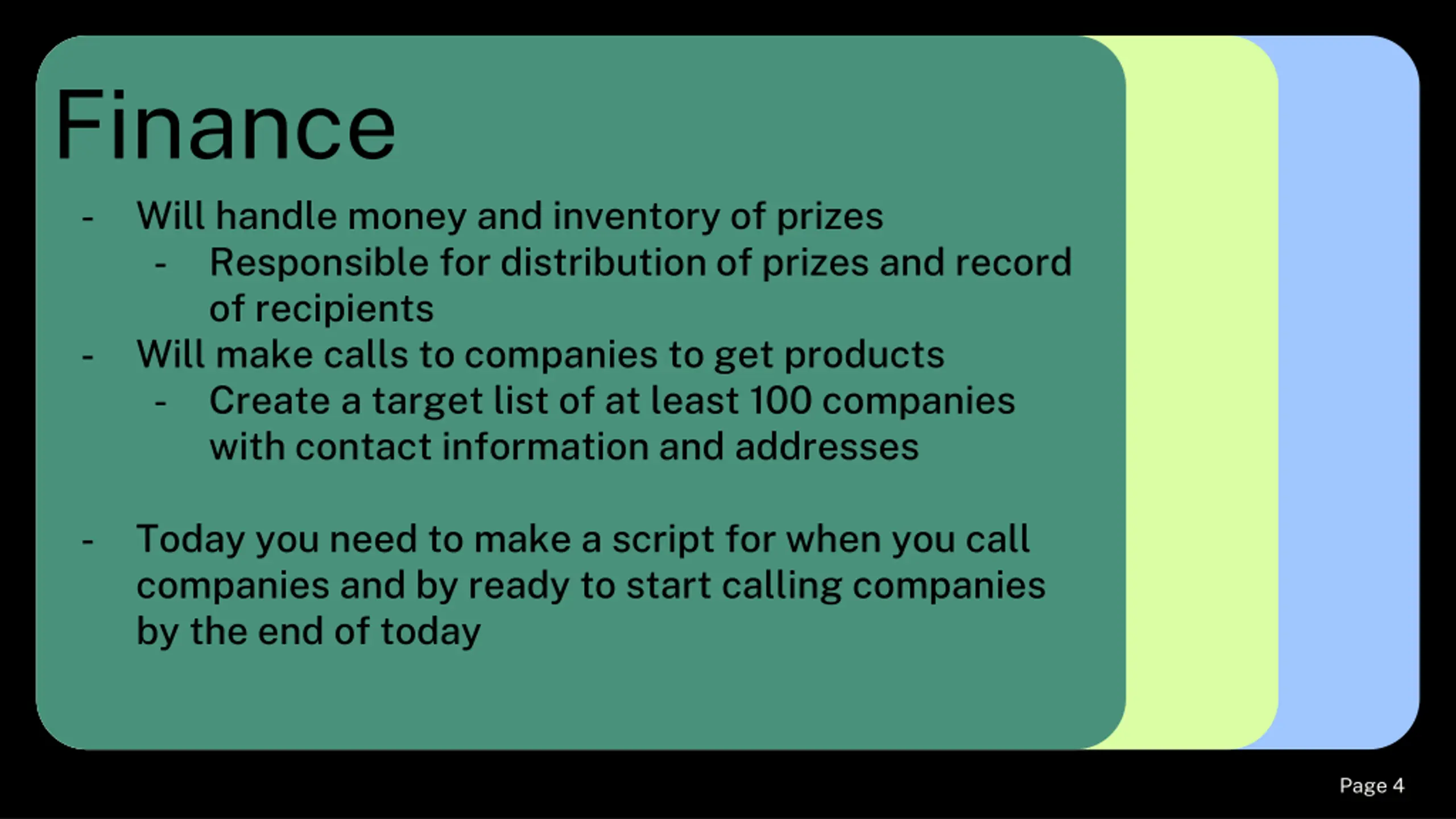 Finance - Will handle money and inventory of prizes - Responsible for distribution of prizes and record of recipients - Will make calls to companies to get products - Create a target list of at least 100 companies with contact information and addresses - Today you need to make a script for when you call companies and by ready to start calling companies by the end of today Page # 4 Page 4
