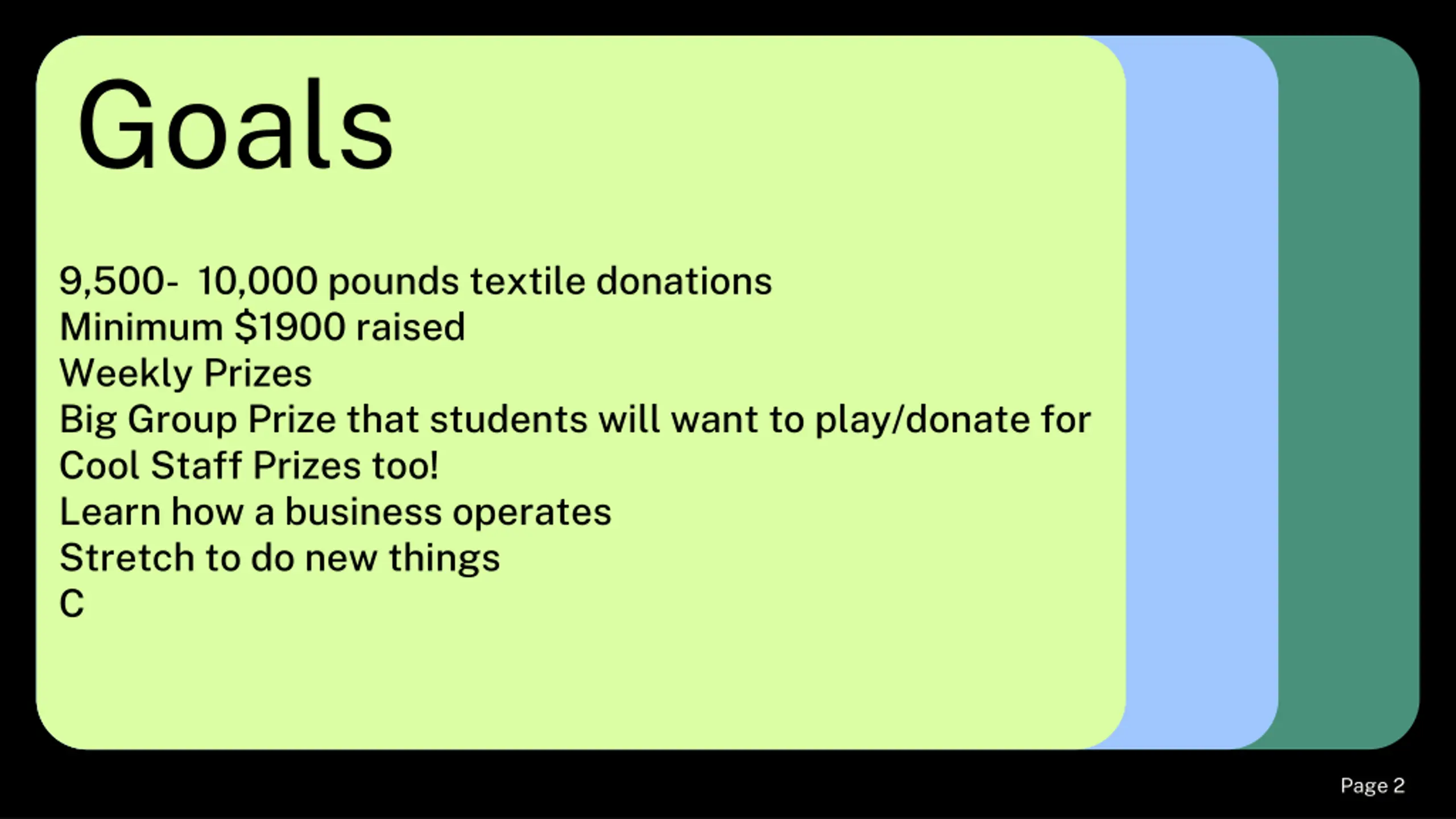 Goals 9,500- 10,000 pounds textile donations Minimum $1900 raised Weekly Prizes Big Group Prize that students will want to play/donate for Cool Staff Prizes too! Learn how a business operates Stretch to do new things C Page # 2 Page 2