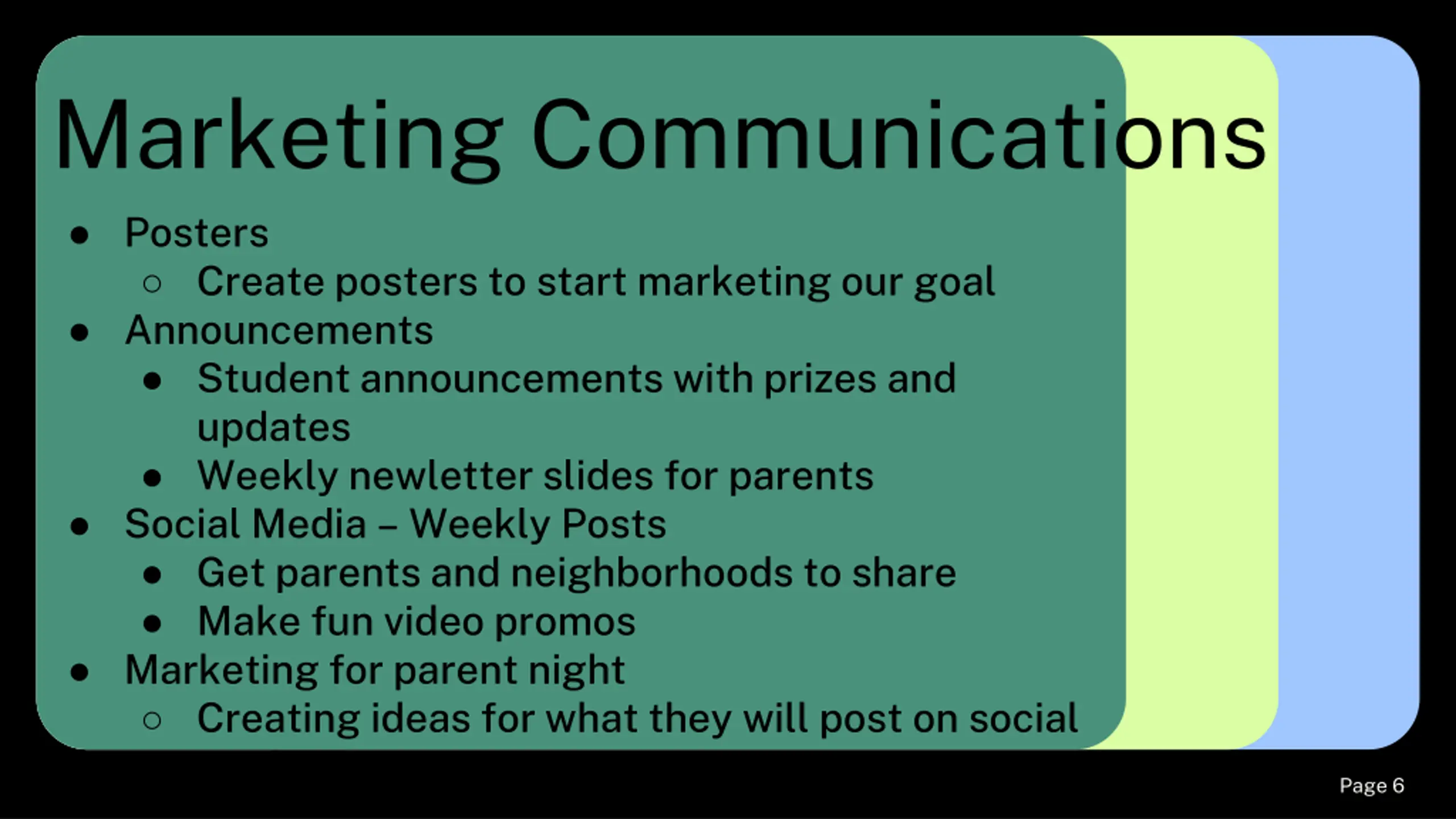 Marketing Communications Posters Create posters to start marketing our goal Announcements Student announcements with prizes and updates Weekly newletter slides for parents Social Media Weekly Posts Get parents and neighborhoods to share Make fun video promos Marketing for parent night Creating ideas for what they will post on social media Page # 6 Page 6