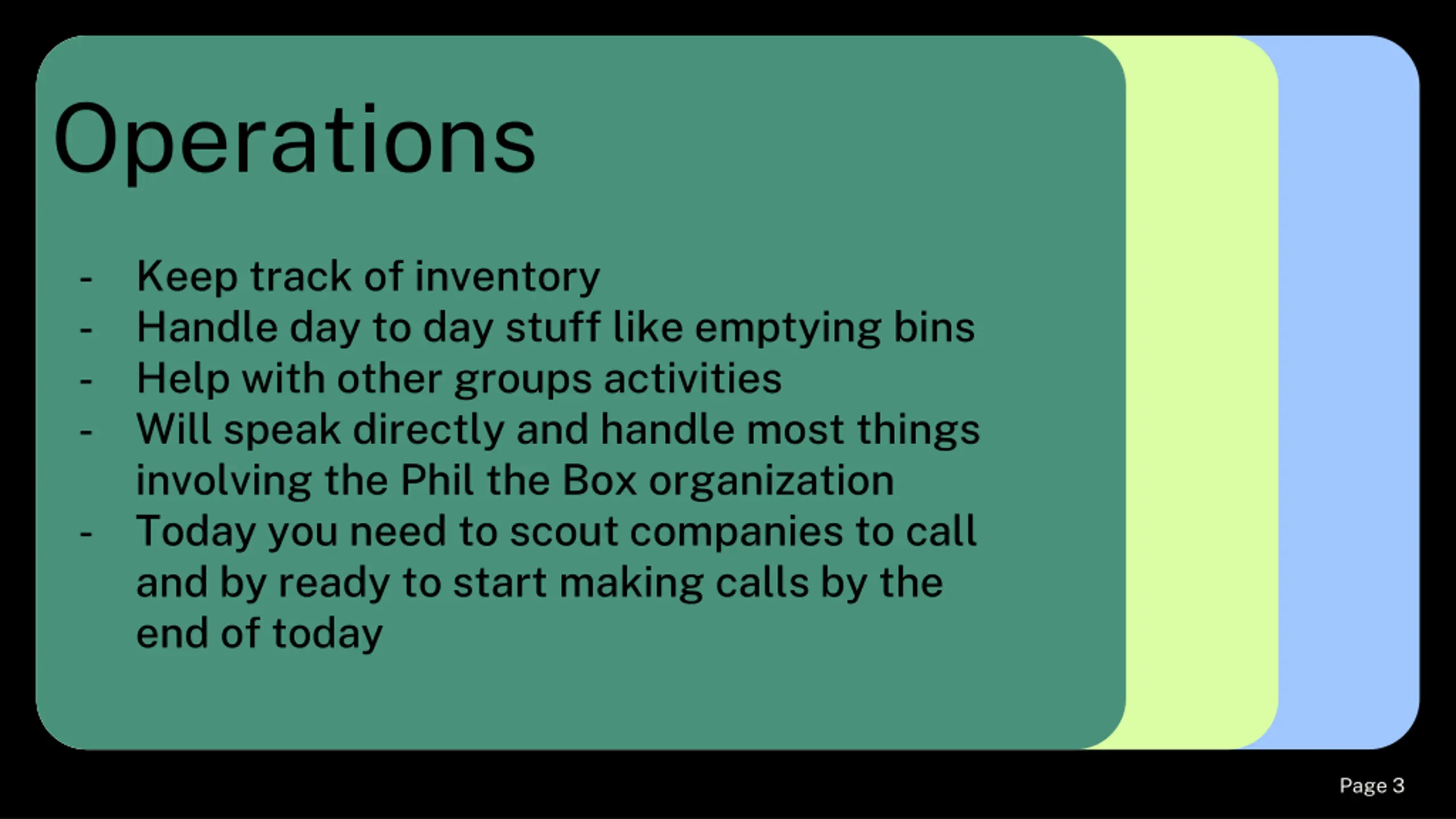 Operations - - - - Keep track of inventory Handle day to day stuff like emptying bins Help with other groups activities Will speak directly and handle most things involving the Phil the Box organization Today you need to scout companies to call and by ready to start making calls by the end of today - Page # 3 Page 3