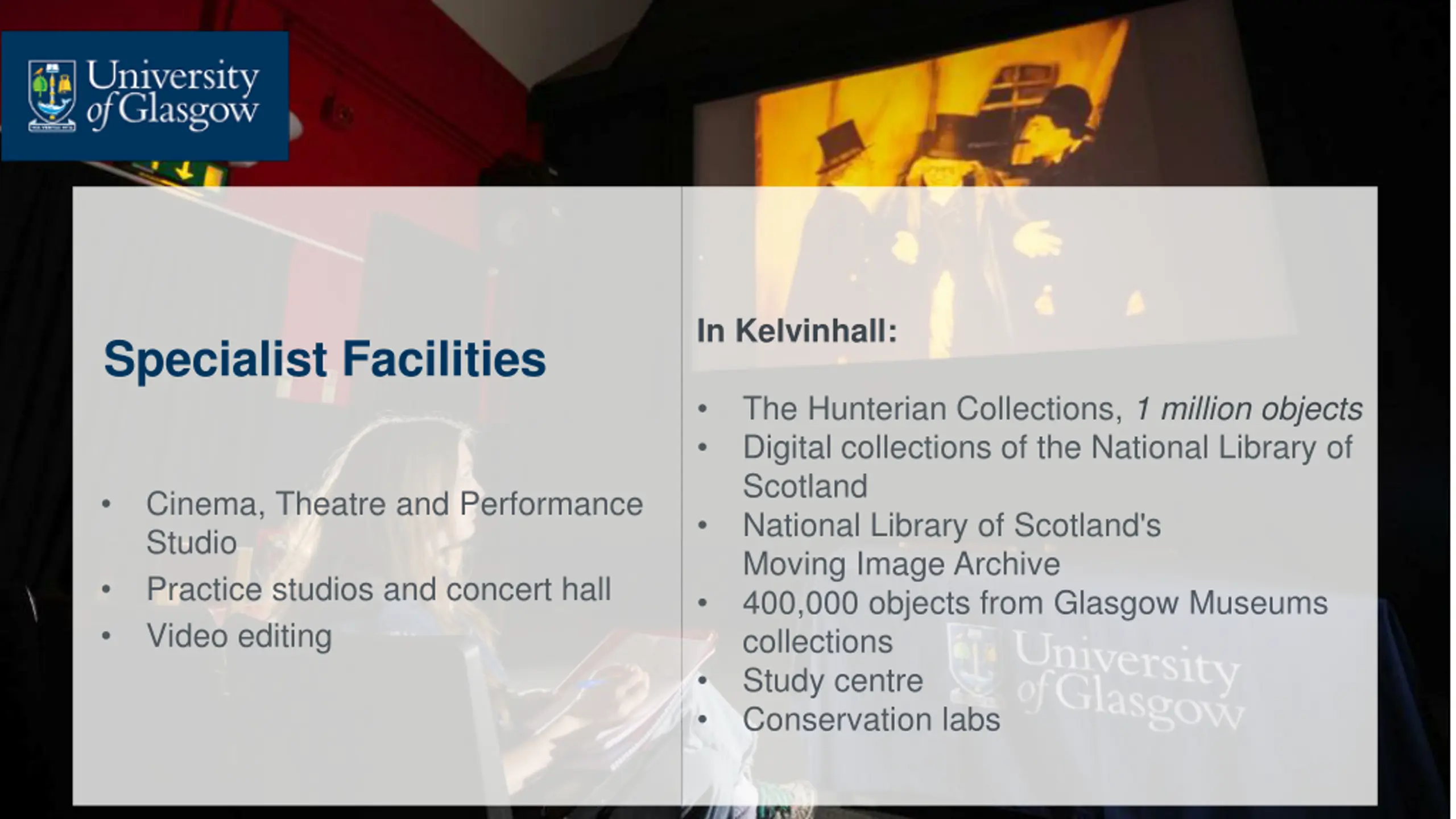 In Kelvinhall: Specialist Facilities The Hunterian Collections, 1 million objects Digital collections of the National Library of Scotland National Library of Scotland's Moving Image Archive 400,000 objects from Glasgow Museums collections Study centre Conservation labs Cinema, Theatre and Performance Studio Practice studios and concert hall Video editing