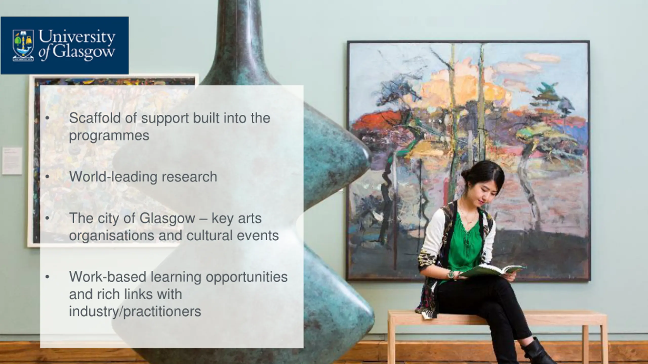 Scaffold of support built into the programmes World-leading research The city of Glasgow key arts organisations and cultural events Work-based learning opportunities and rich links with industry/practitioners