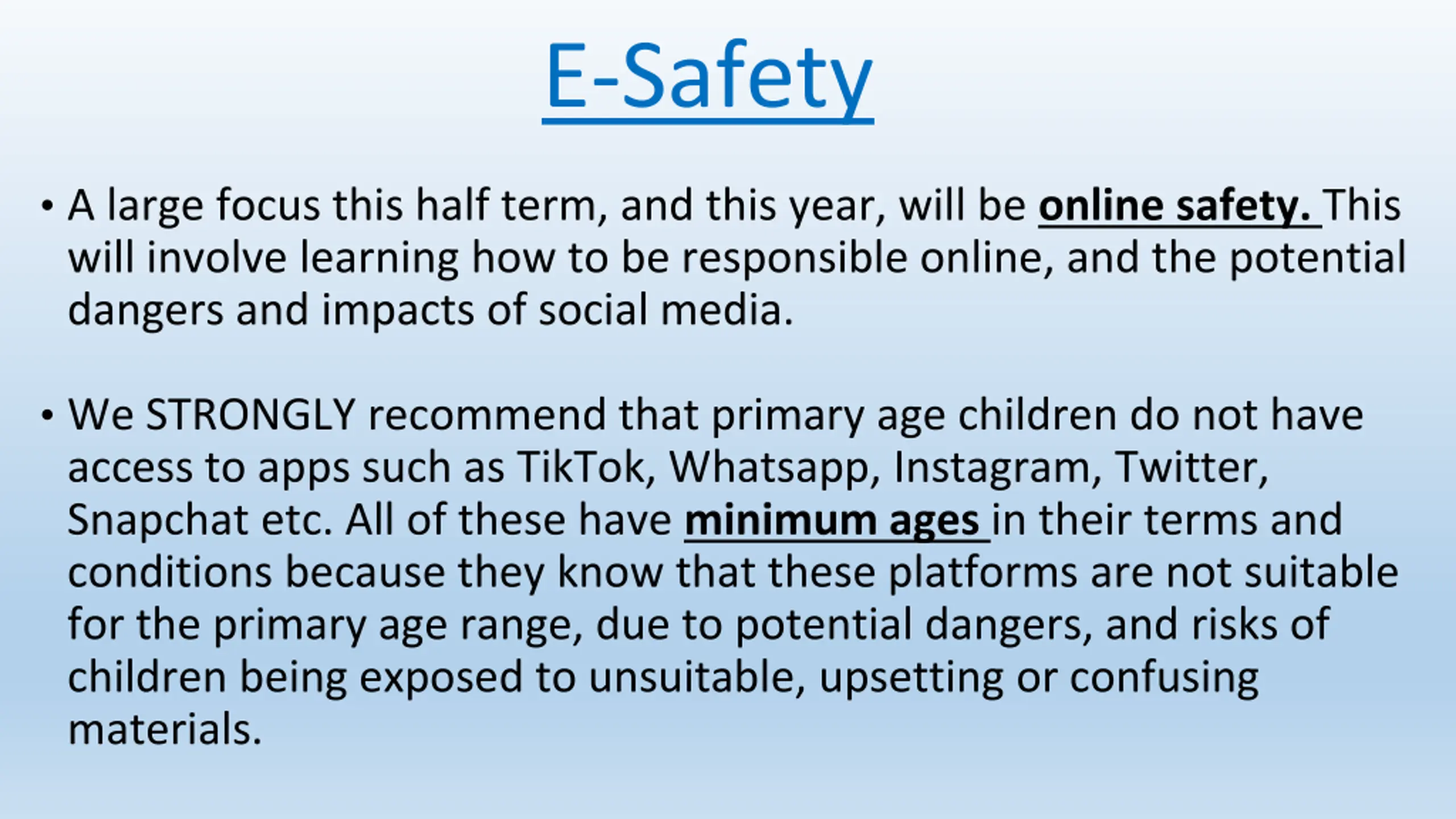 E-Safety A large focus this half term, and this year, will be online safety. This will involve learning how to be responsible online, and the potential dangers and impacts of social media. We STRONGLY recommend that primary age children do not have access to apps such as TikTok, Whatsapp, Instagram, Twitter, Snapchat etc. All of these have minimum ages in their terms and conditions because they know that these platforms are not suitable for the primary age range, due to potential dangers, and risks of children being exposed to unsuitable, upsetting or confusing materials.