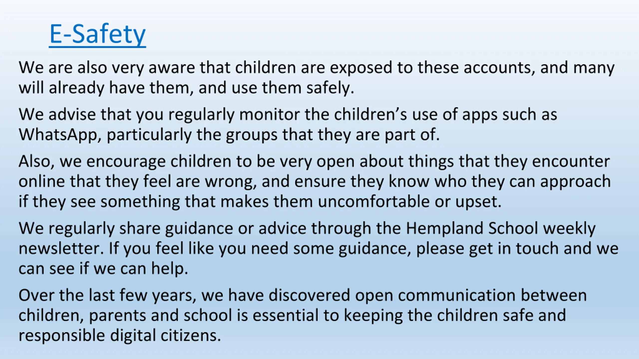 E-Safety We are also very aware that children are exposed to these accounts, and many will already have them, and use them safely. We advise that you regularly monitor the children s use of apps such as WhatsApp, particularly the groups that they are part of. Also, we encourage children to be very open about things that they encounter online that they feel are wrong, and ensure they know who they can approach if they see something that makes them uncomfortable or upset. We regularly share guidance or advice through the Hempland School weekly newsletter. If you feel like you need some guidance, please get in touch and we can see if we can help. Over the last few years, we have discovered open communication between children, parents and school is essential to keeping the children safe and responsible digital citizens.