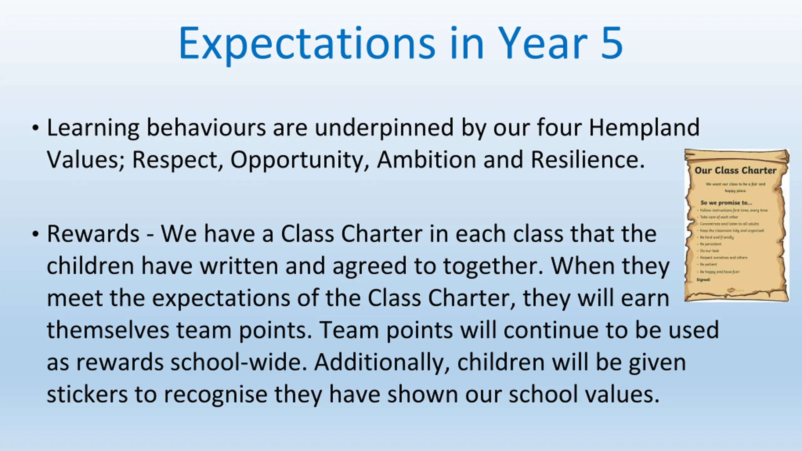 Expectations in Year 5 Learning behaviours are underpinned by our four Hempland Values; Respect, Opportunity, Ambition and Resilience. Rewards - We have a Class Charter in each class that the children have written and agreed to together. When they meet the expectations of the Class Charter, they will earn themselves team points. Team points will continue to be used as rewards school-wide. Additionally, children will be given stickers to recognise they have shown our school values.