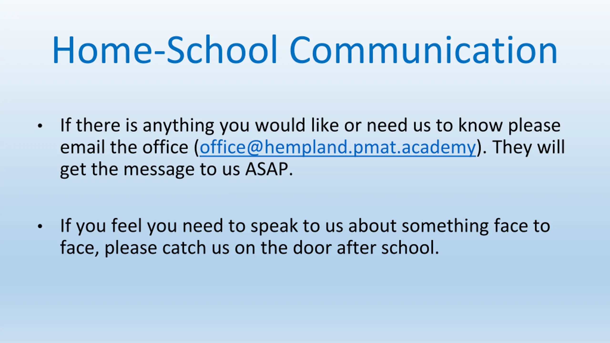 Home-School Communication If there is anything you would like or need us to know please email the office (office@hempland.pmat.academy). They will get the message to us ASAP. If you feel you need to speak to us about something face to face, please catch us on the door after school.