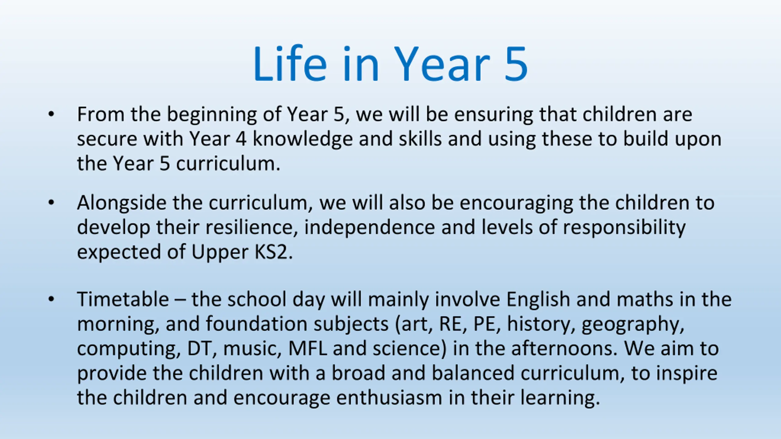 Life in Year 5 From the beginning of Year 5, we will be ensuring that children are secure with Year 4 knowledge and skills and using these to build upon the Year 5 curriculum. Alongside the curriculum, we will also be encouraging the children to develop their resilience, independence and levels of responsibility expected of Upper KS2. Timetable the school day will mainly involve English and maths in the morning, and foundation subjects (art, RE, PE, history, geography, computing, DT, music, MFL and science) in the afternoons. We aim to provide the children with a broad and balanced curriculum, to inspire the children and encourage enthusiasm in their learning.