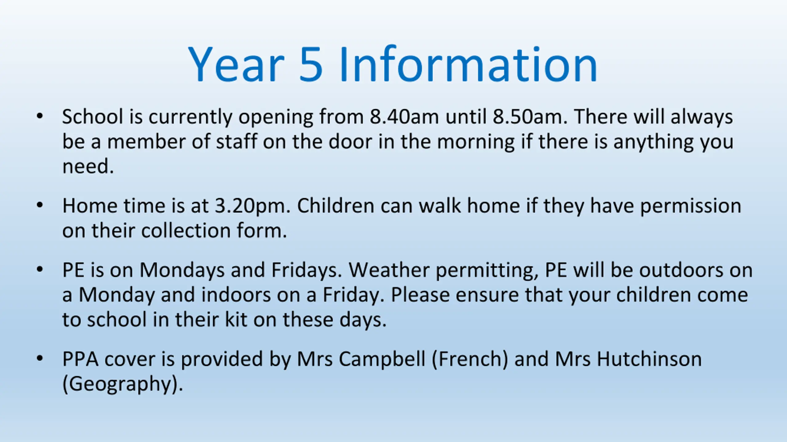 Year 5 Information School is currently opening from 8.40am until 8.50am. There will always be a member of staff on the door in the morning if there is anything you need. Home time is at 3.20pm. Children can walk home if they have permission on their collection form. PE is on Mondays and Fridays. Weather permitting, PE will be outdoors on a Monday and indoors on a Friday. Please ensure that your children come to school in their kit on these days. PPA cover is provided by Mrs Campbell (French) and Mrs Hutchinson (Geography).