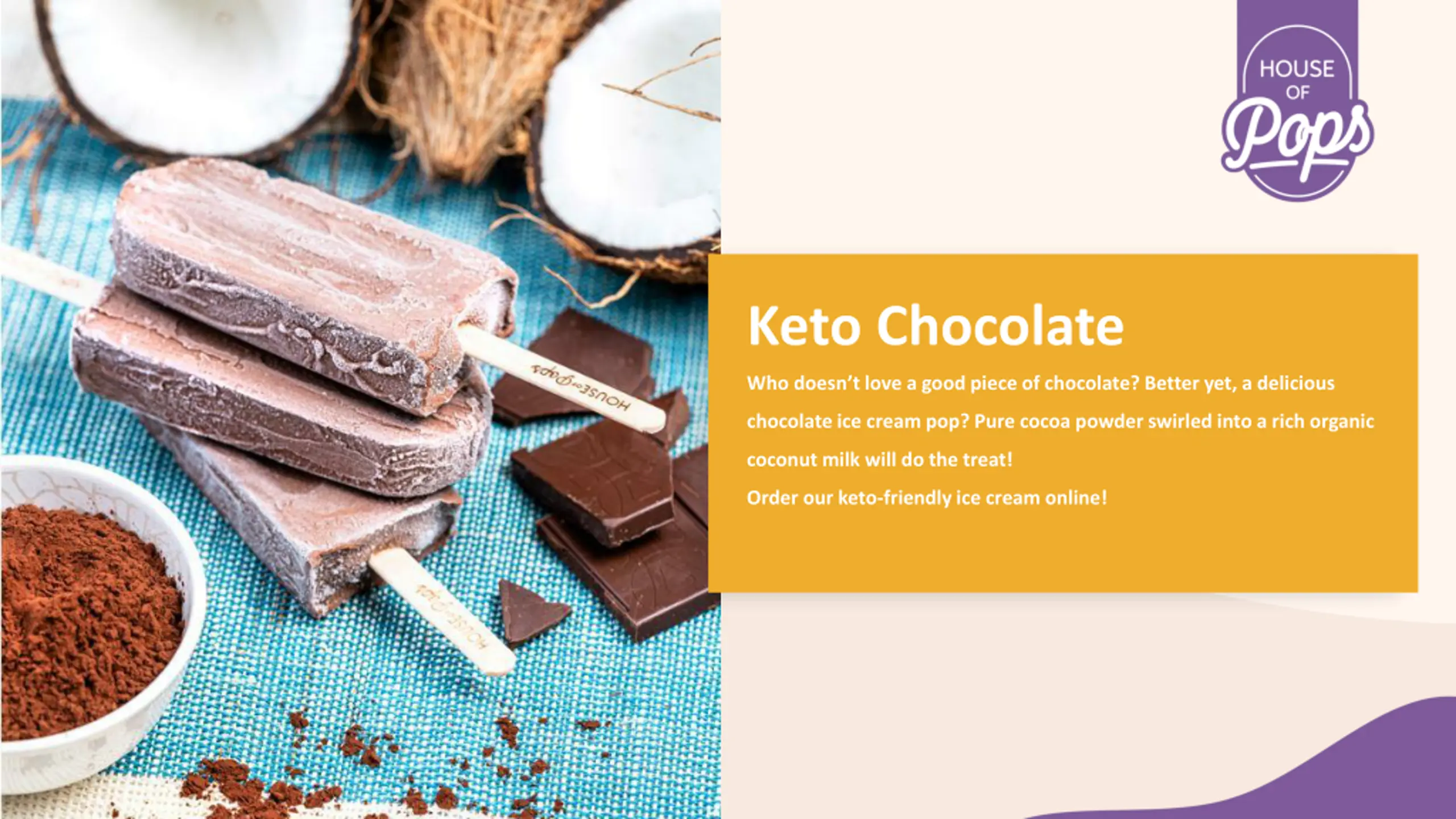 Keto Chocolate Who doesn t love a good piece of chocolate? Better yet, a delicious chocolate ice cream pop? Pure cocoa powder swirled into a rich organic coconut milk will do the treat! Order our keto-friendly ice cream online!