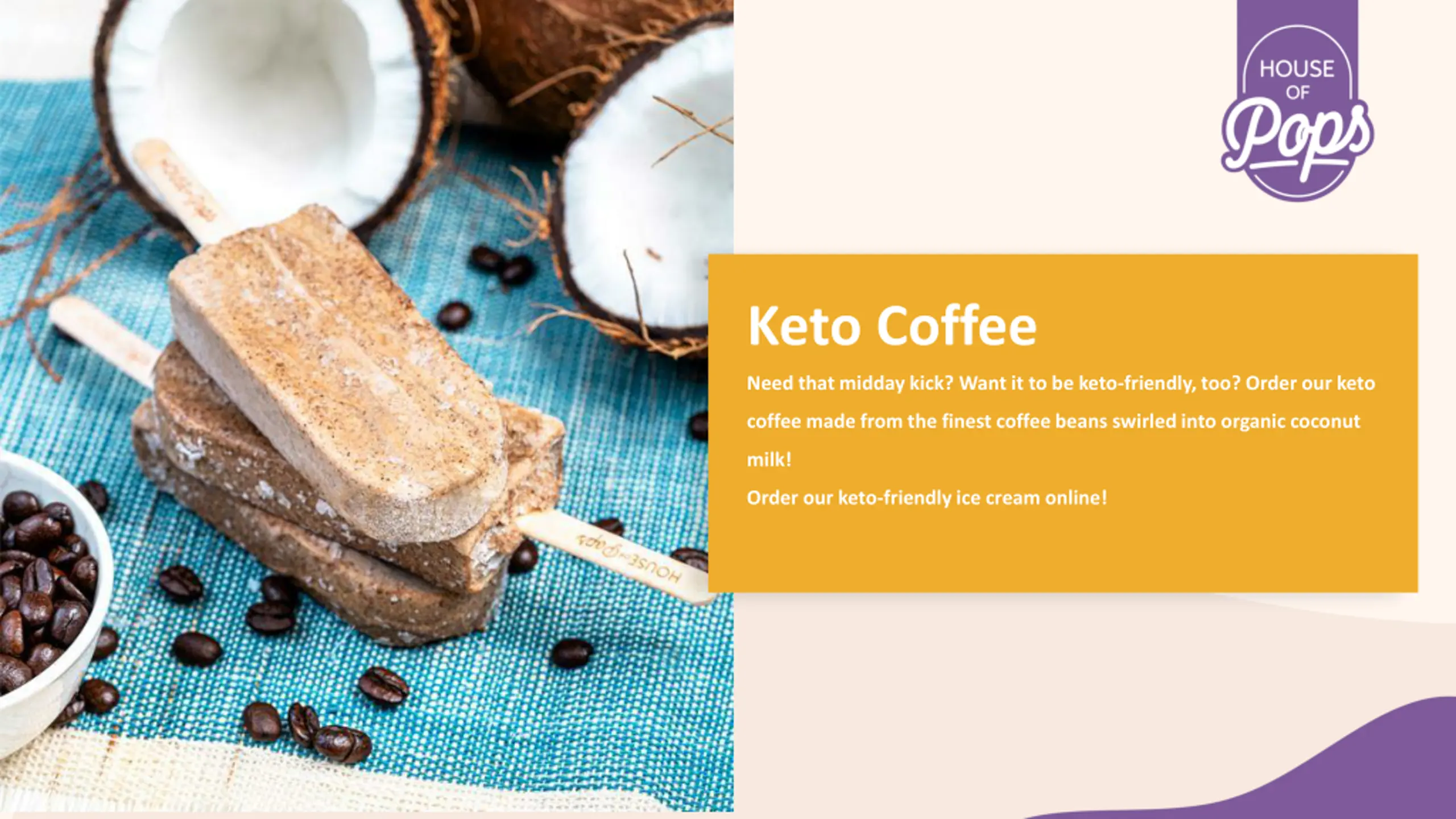 Keto Coffee Need that midday kick? Want it to be keto-friendly, too? Order our keto coffee made from the finest coffee beans swirled into organic coconut milk! Order our keto-friendly ice cream online!