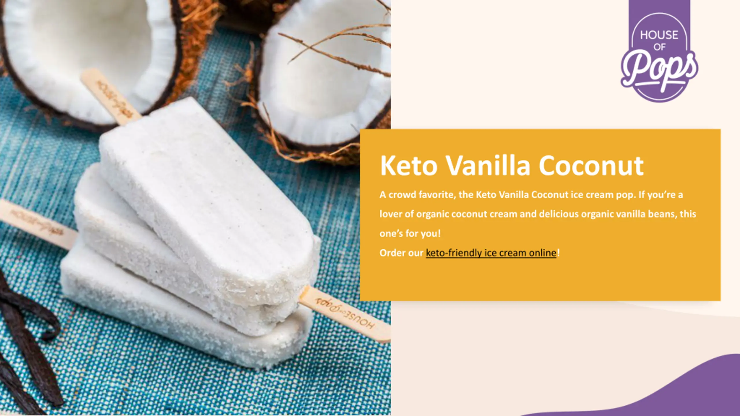 Keto Vanilla Coconut A crowd favorite, the Keto Vanilla Coconut ice cream pop. If you re a lover of organic coconut cream and delicious organic vanilla beans, this one s for you! Order our keto-friendly ice cream online!