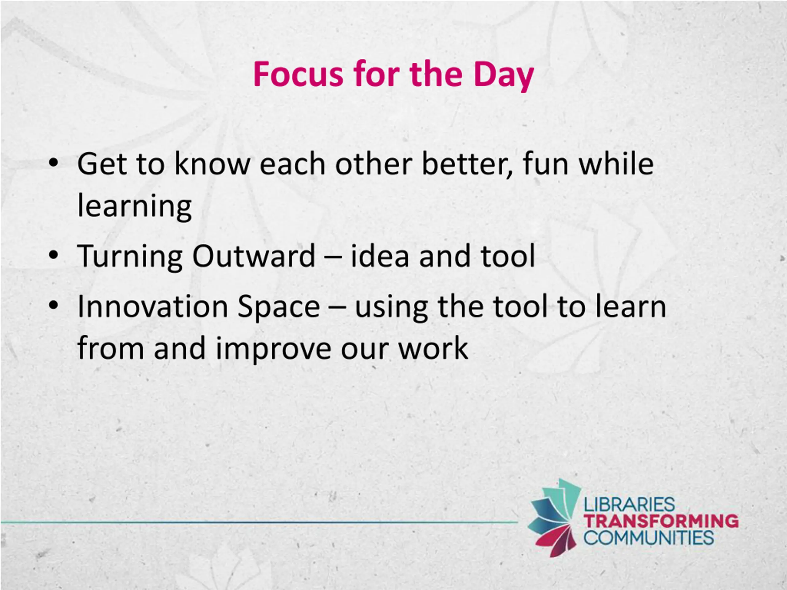 Focus for the Day Get to know each other better, fun while learning Turning Outward idea and tool Innovation Space using the tool to learn from and improve our work
