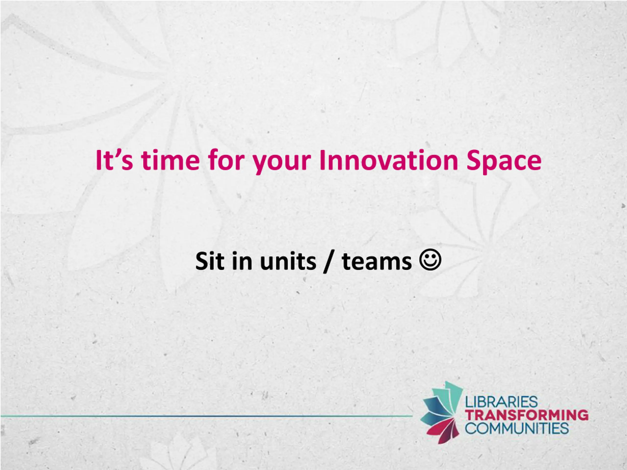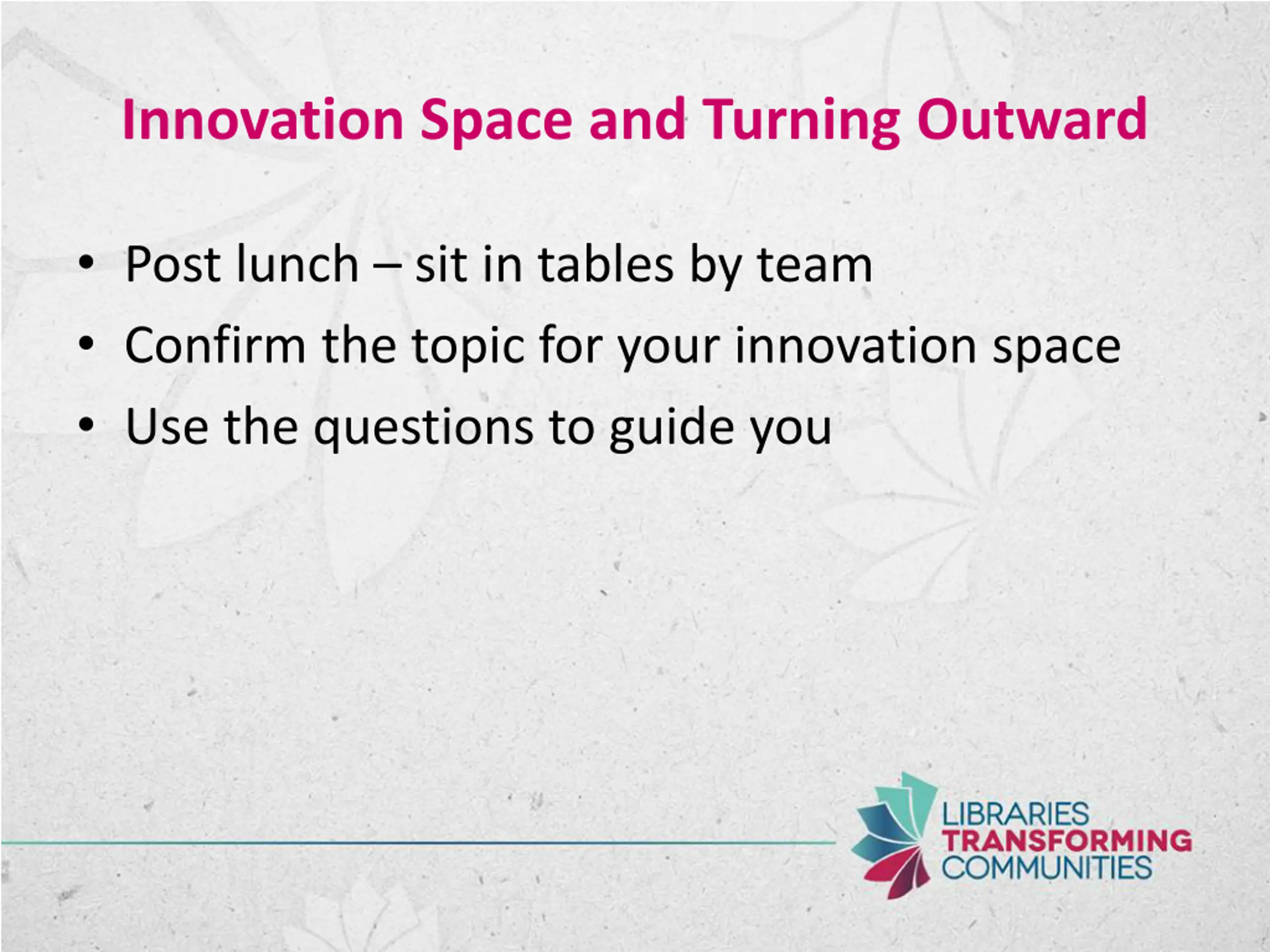 Innovation Space and Turning Outward Post lunch sit in tables by team Confirm the topic for your innovation space Use the questions to guide you