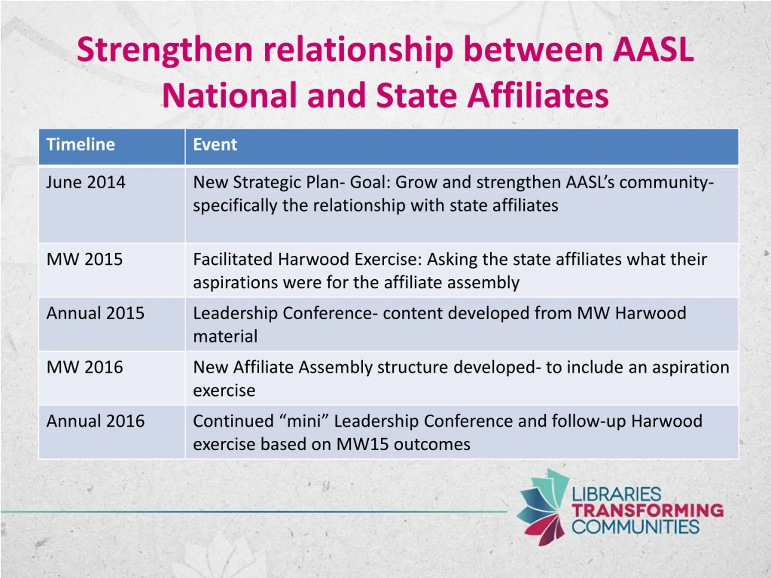 Strengthen relationship between AASL National and State Affiliates Timeline Event June 2014 New Strategic Plan- Goal: Grow and strengthen AASL s community- specifically the relationship with state affiliates MW 2015 Facilitated Harwood Exercise: Asking the state affiliates what their aspirations were for the affiliate assembly Annual 2015 Leadership Conference- content developed from MW Harwood material MW 2016 New Affiliate Assembly structure developed- to include an aspiration exercise Annual 2016 Continued mini Leadership Conference and follow-up Harwood exercise based on MW15 outcomes
